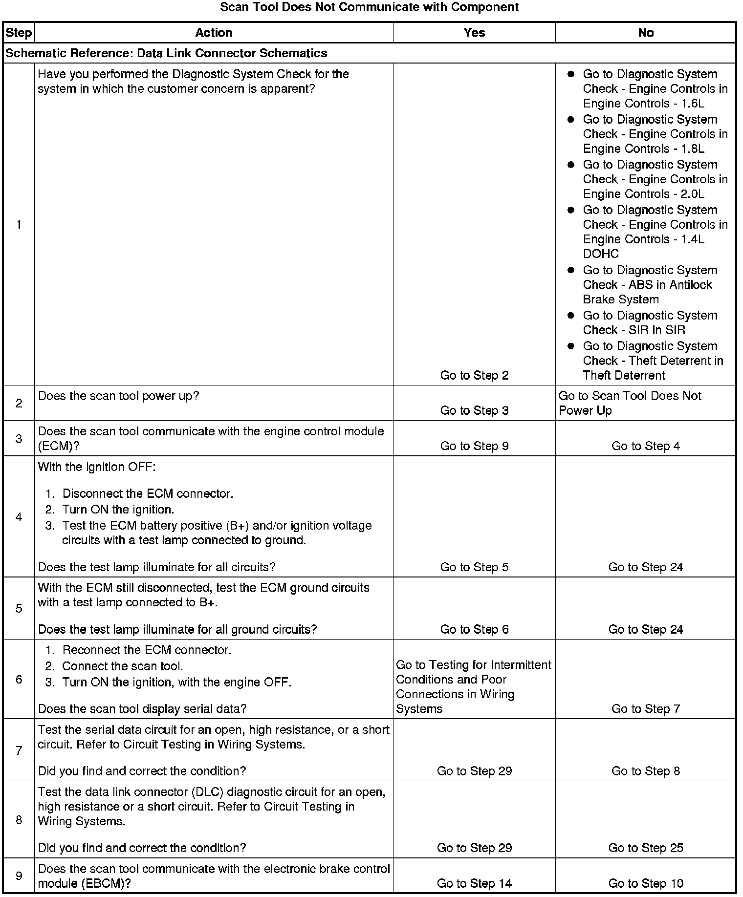 This step checks whether the scan tool can communicate with other control modules on the vehicle. If the scan tool can communicate with one of the other modules then the DLC connector, the shared circuits, and the scan tool are OK.