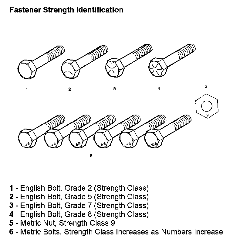 The most commonly used metric fastener strength property classes are 9.8 and 10.9. The class identification is embossed on the head of each bolt. The English, inch strength classes range from grade 2 to grade 8. Radial lines are embossed on the head of each bolt in order to identify the strength class. The number of lines on the head of the bolt is 2 lines less than the actual grade. For example, a grade 8 bolt will have 6 radial lines on the bolt head. Some metric nuts are marked with a single digit strength identification number on the nut face.