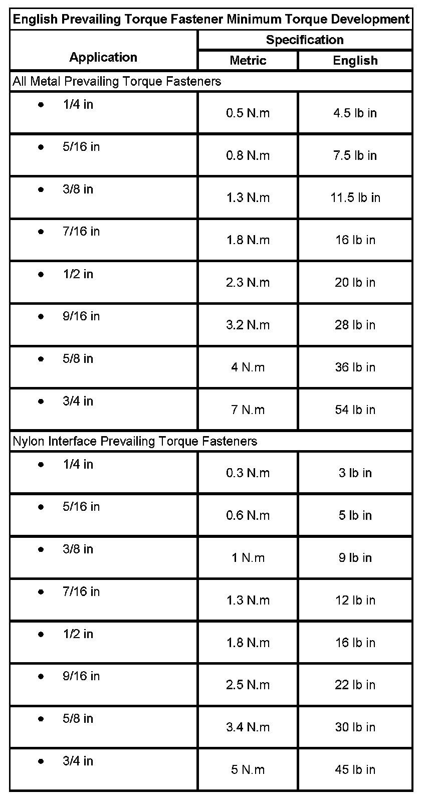 English Prevailing Torque Fastener Minimum Torque Development: