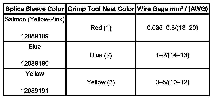 5. Use the Splice Crimp Tool from the J-38125 to crimp duraseal splice sleeve. In order to position the duraseal splice sleeve in the proper color nest of the Splice Crimp Tool, refer to the table at the beginning of this repair procedure.