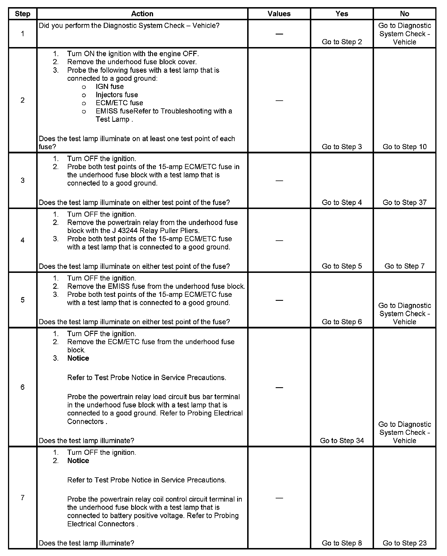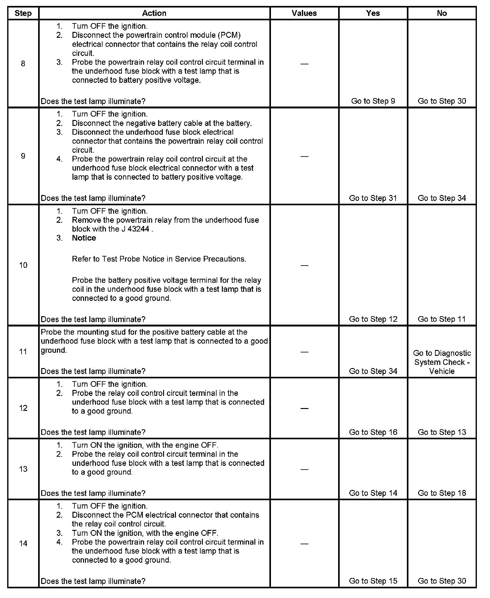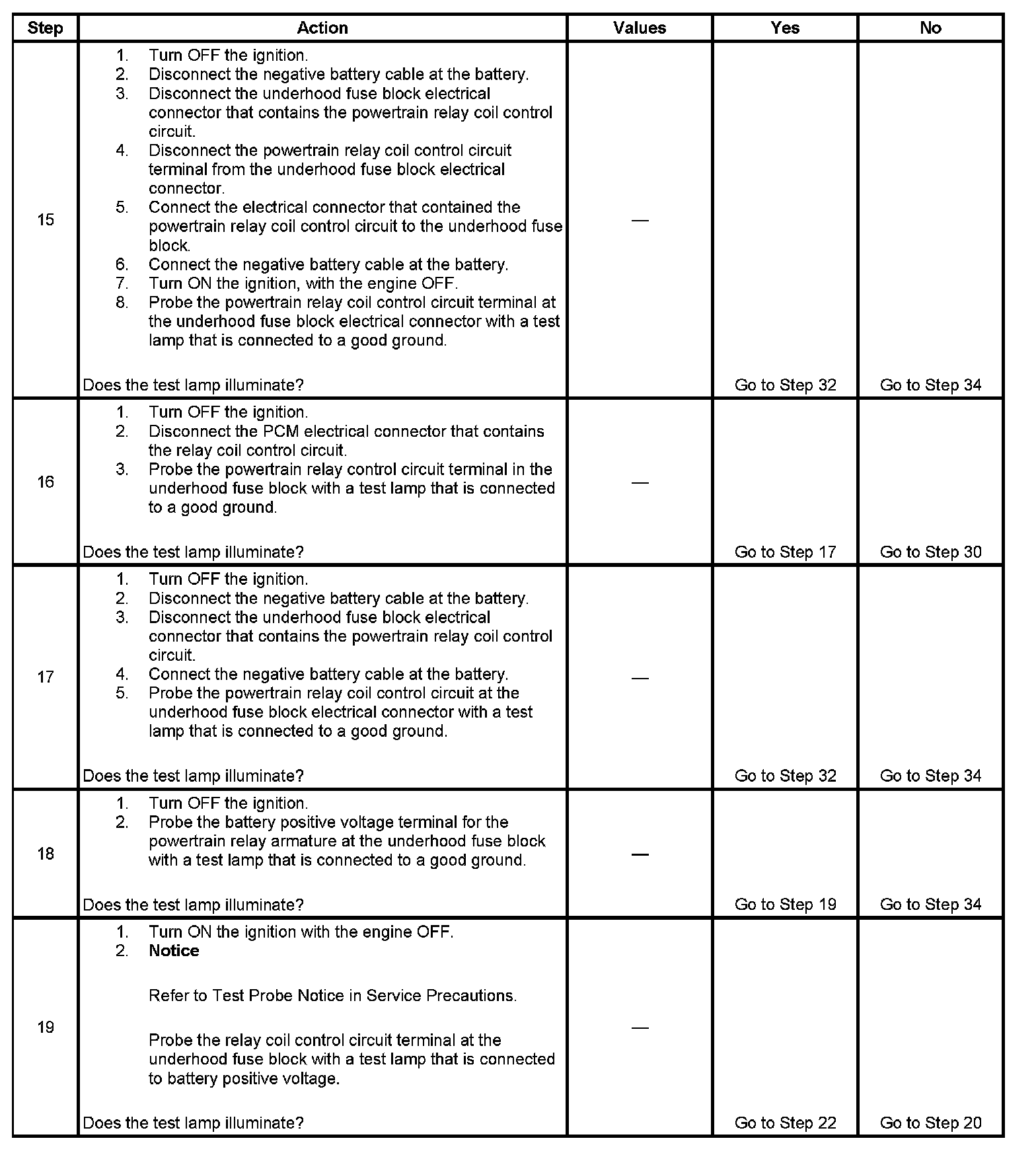 The powertrain relay system diagnosis table assumes that the vehicle battery is fully charged. Refer to Battery Inspection/Test. Battery Inspection/Test