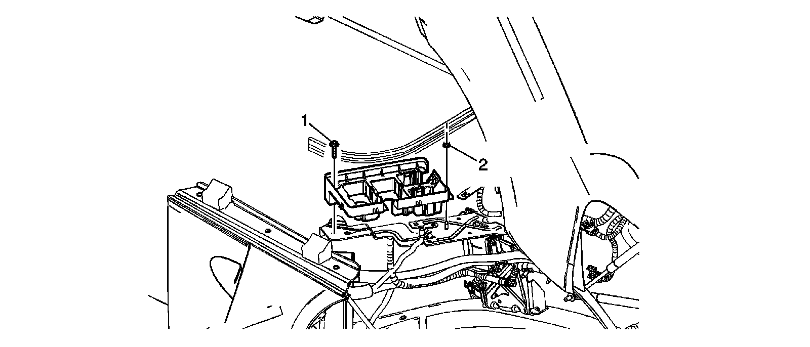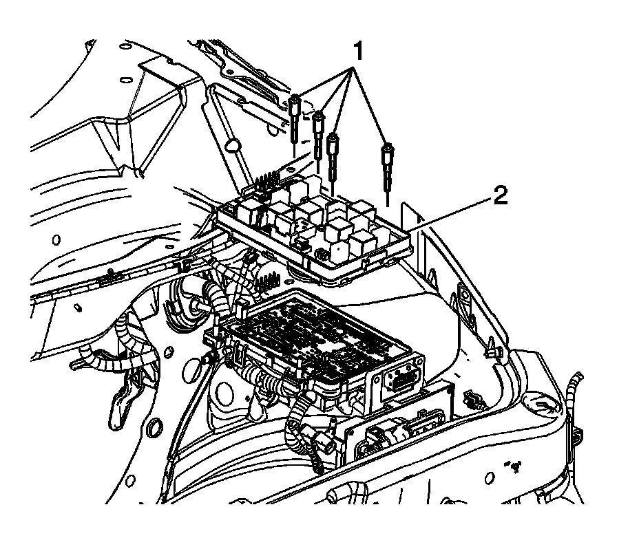 6. Remove the fasteners (1) and (2) that secure the electrical center to vehicle.