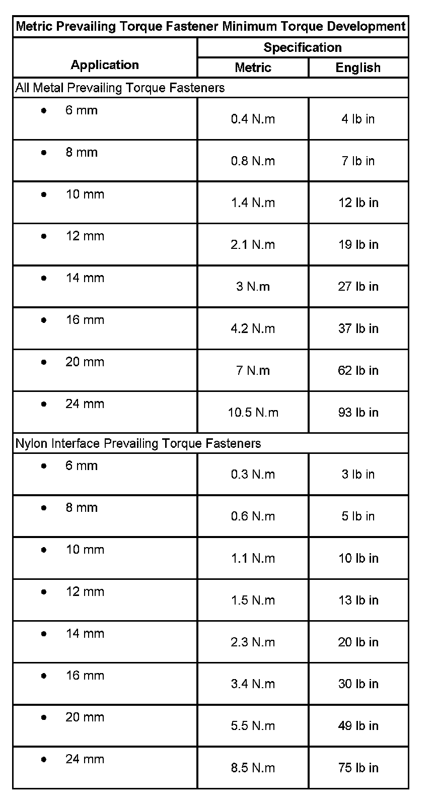 Metric Prevailing Torque Fastener Minimum Torque Development
