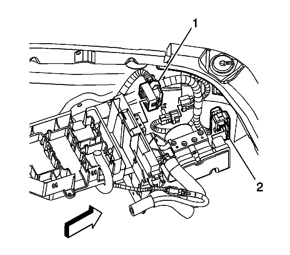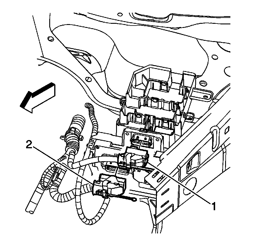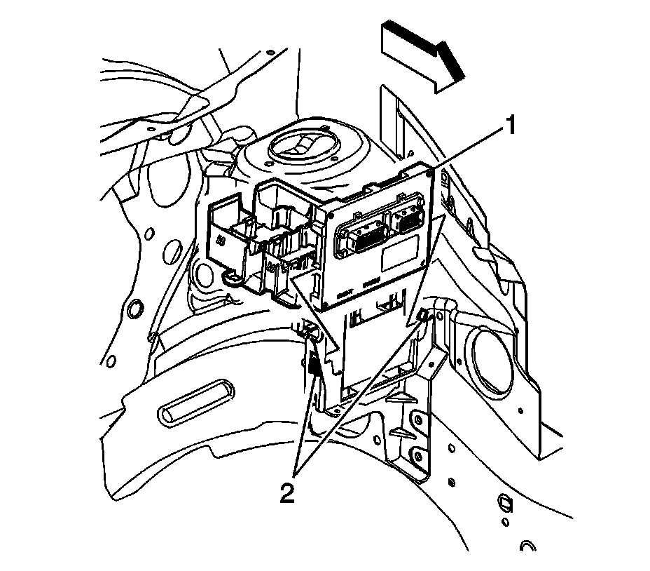 1. Slide the ECM (1) into the ECM/TCM bracket until the retaining tabs (2) engage the ECM.