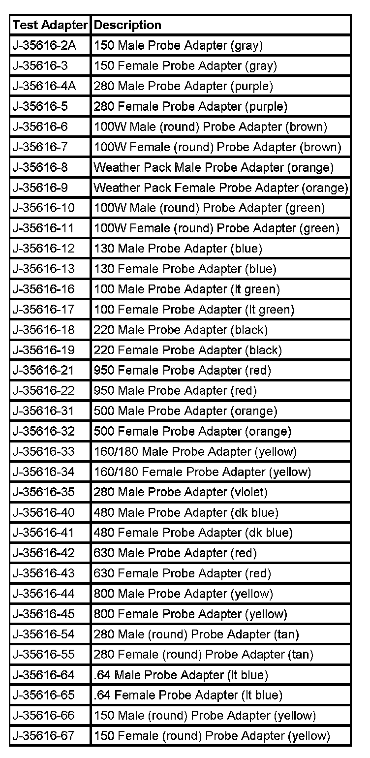 NOTE: Do not insert test equipment probes (DVOM etc.) into any connector or fuse block terminal. The diameter of the test probes will deform most terminals. A deformed terminal will cause a poor connection, which will result in a system failure. Always use the J-35616 GM-Approved Terminal Test Kit or the J 42675 Flat-Wire Probe Adapter in order to front probe terminals. Do not use paper clips or other substitutes to probe terminals.