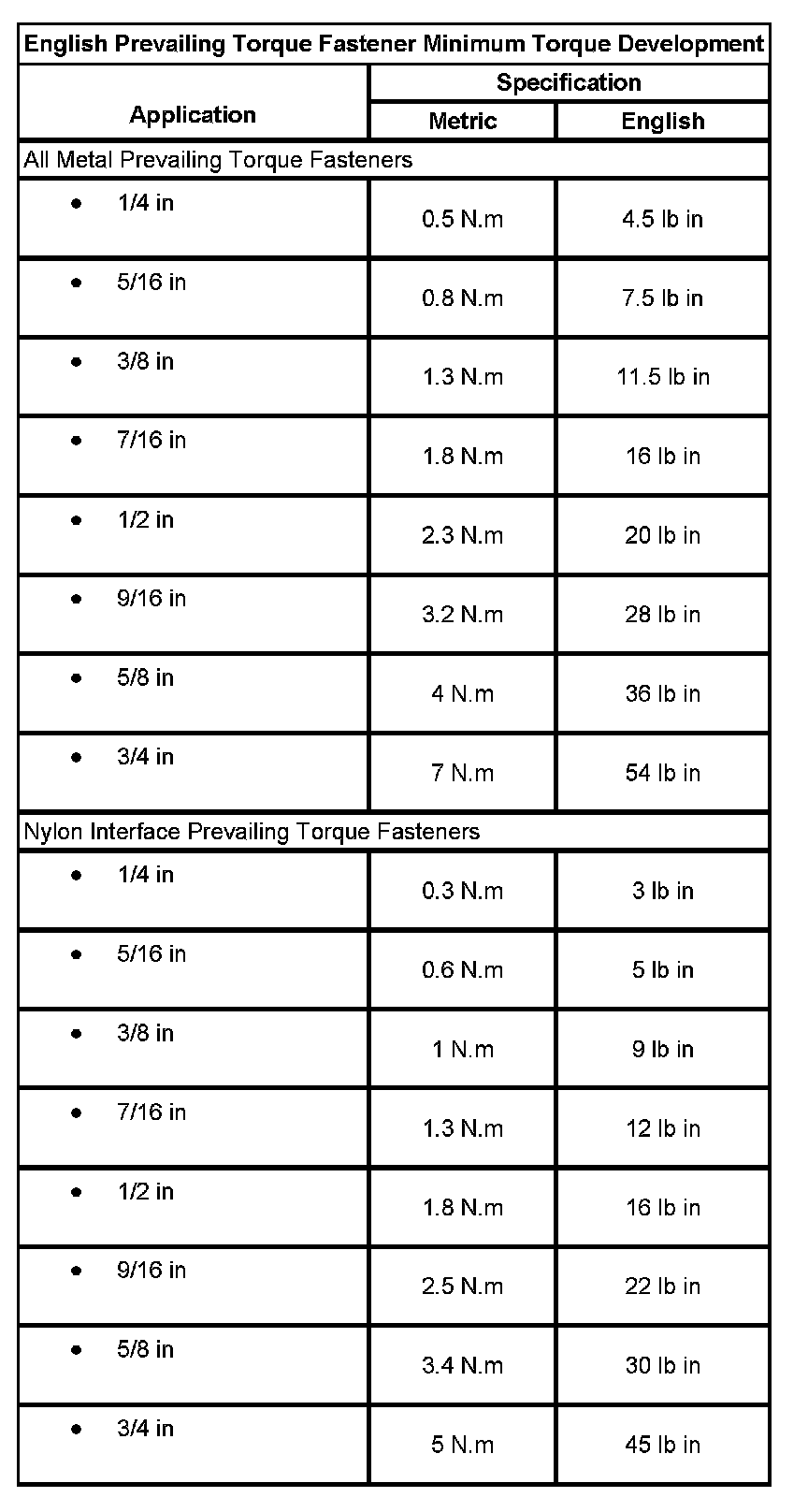 ENGLISH PREVAILING TORQUE FASTENER MINIMUM TORQUE DEVELOPMENT