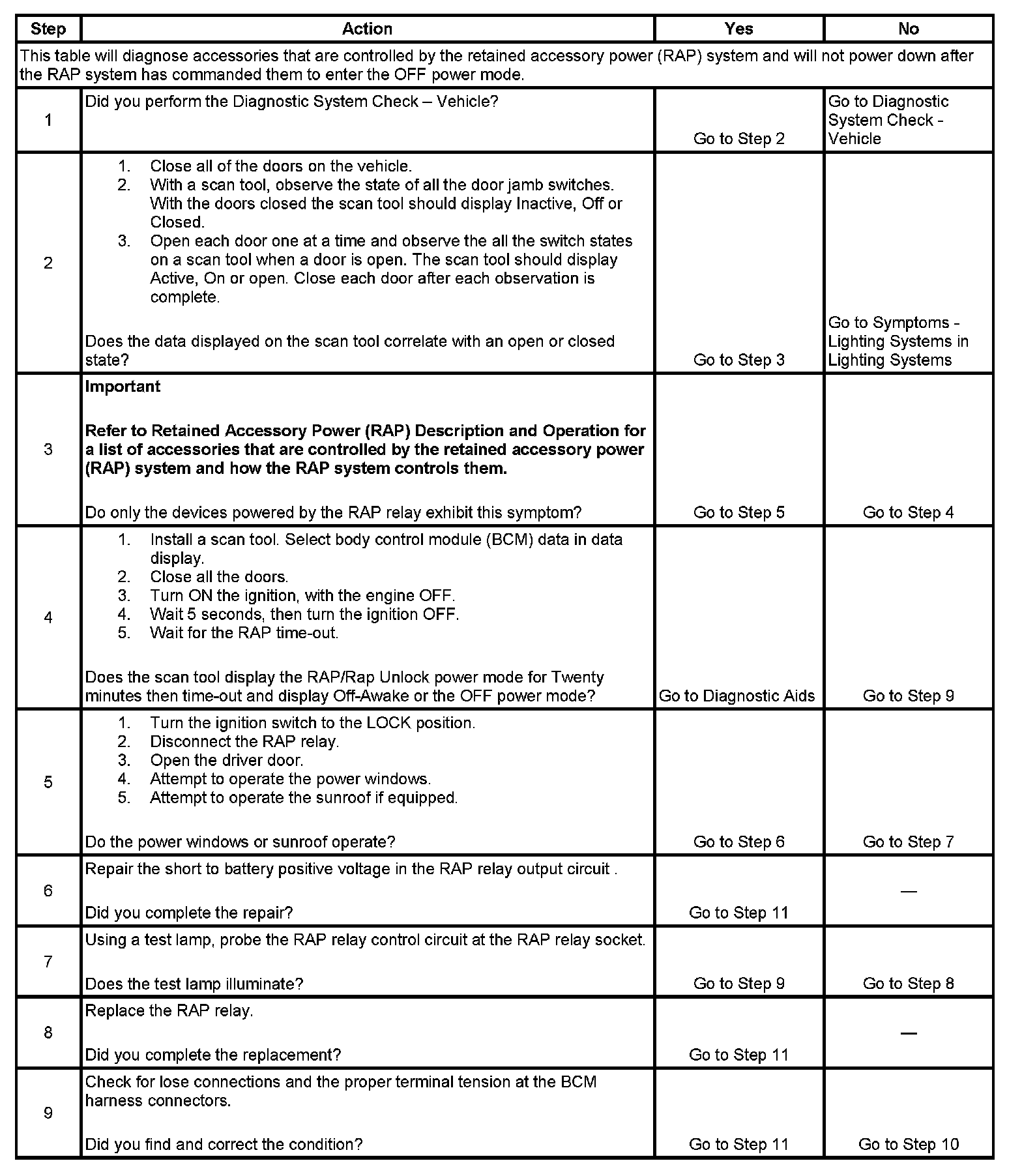 Home >> Chevrolet >> 2006 >> Uplander AWD V6-3.9L VIN 1 >> Repair and Diagnosis >> Powertrain Management >> Computers and Control Systems >> Relays and Modules - Computers and Control Systems >> Body Control Module >> Testing and Inspection >> Symptom Related Diagnostic Procedures >> Retained Accessory Power (RAP) On After Time-Out