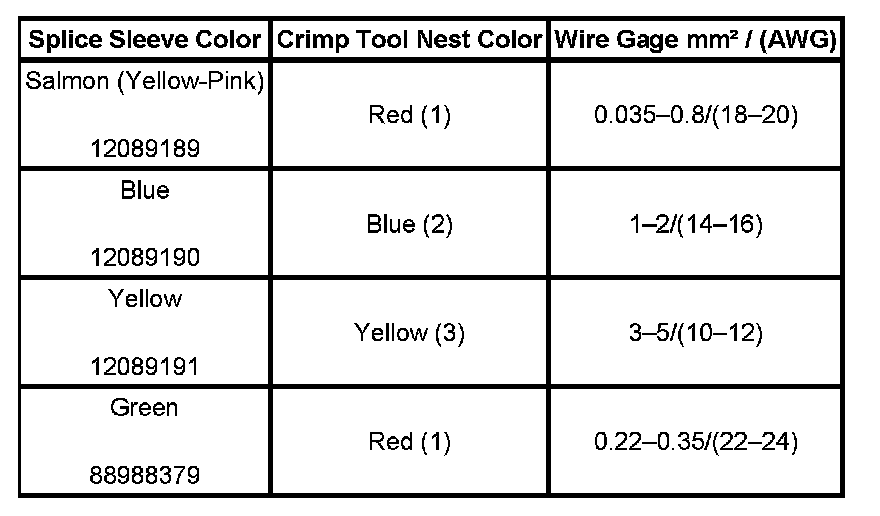 5. Use the Splice Crimp Tool from the J-38125 to crimp duraseal splice sleeve. In order to position the duraseal splice sleeve in the proper color nest of the Splice Crimp Tool, refer to the table at the beginning of this repair procedure.