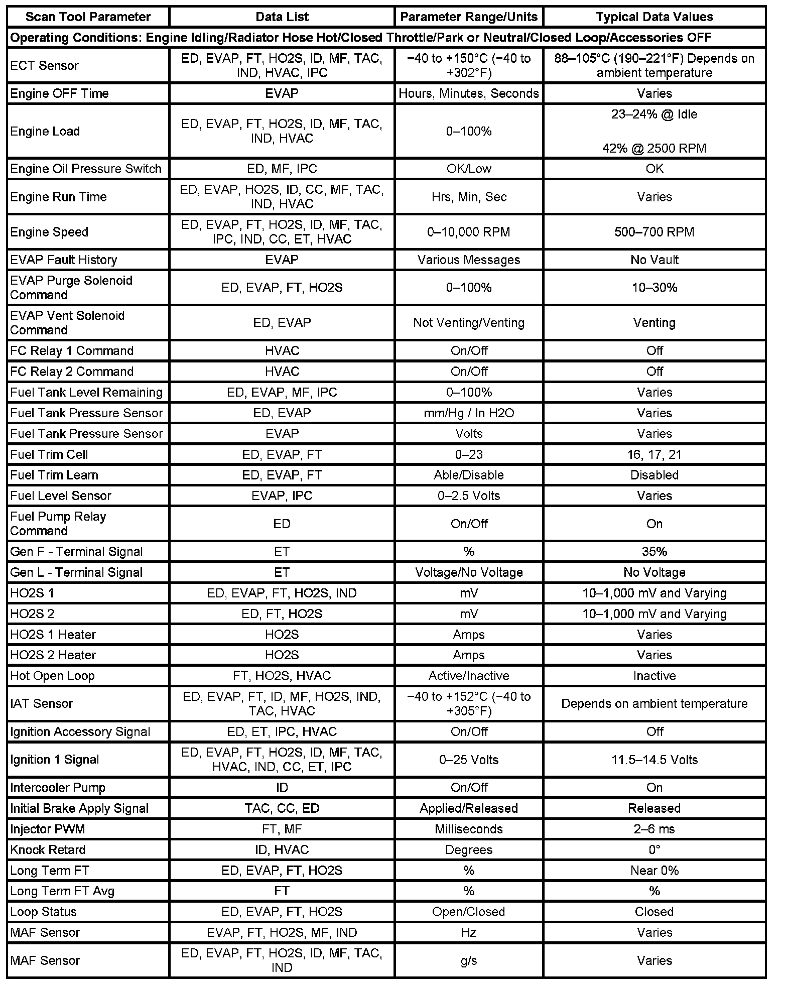 The Engine Scan Tool Data List contains all engine related parameters that are available on the scan tool. The list is arranged in alphabetical order. A given parameter may appear in any one of the data lists, and in some cases may appear more than once, or in more than one data list in order to group certain related parameters together.
