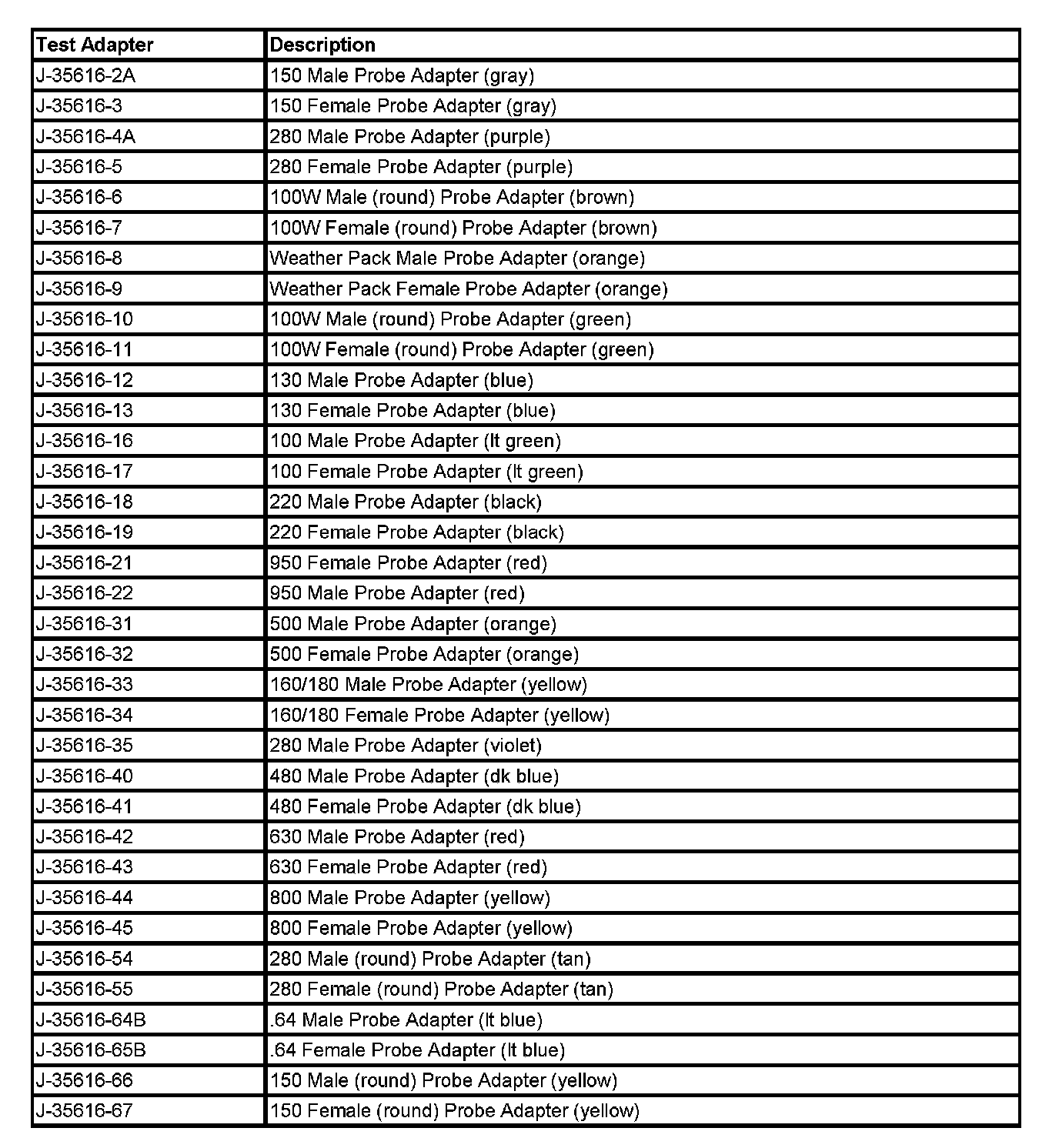 Refer to the table as a guide in selecting the correct test adapter for frontprobing connectors: