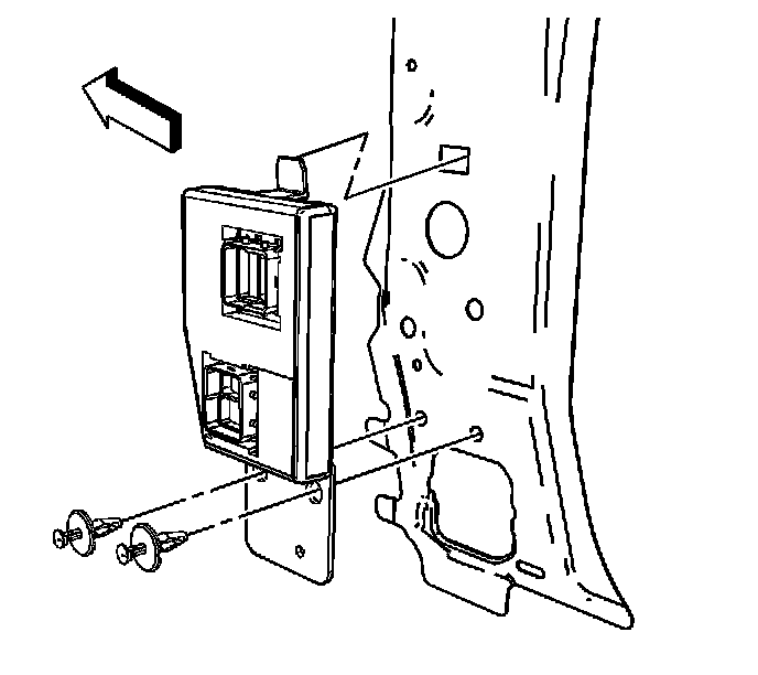 6. Remove the 2 fasteners retaining the BCM to the hinge pillar.