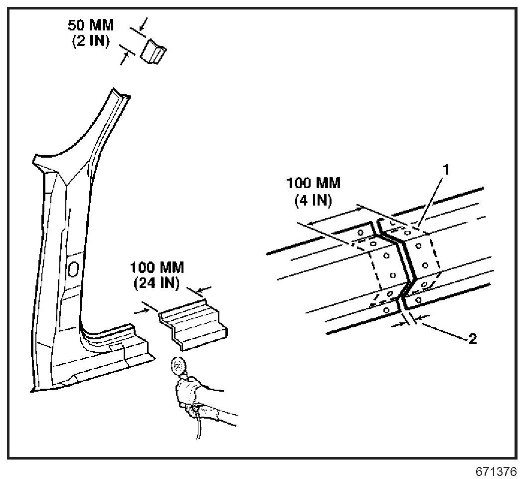 2. Create a 50 mm (2 in) backing plate (1) from the unused portion of the service part. Trim the backing plate as necessary to fit behind the sectioning joint where there is no reinforcement.