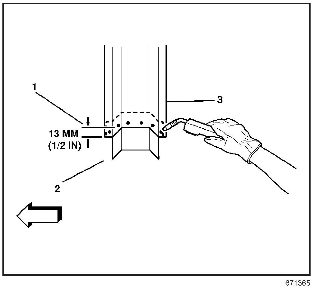 9. Locate and drill out all factory welds. Note the number and location of the welds for installations of the service part.