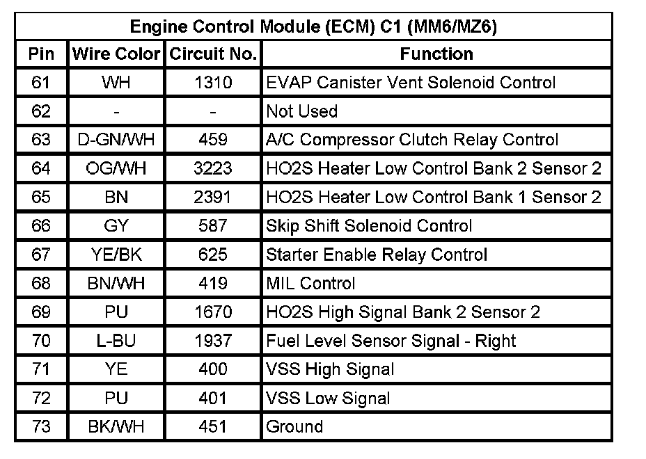 Engine Control Module (ECM) C1 (MM6/MZ6) (Pin 61 To 73):