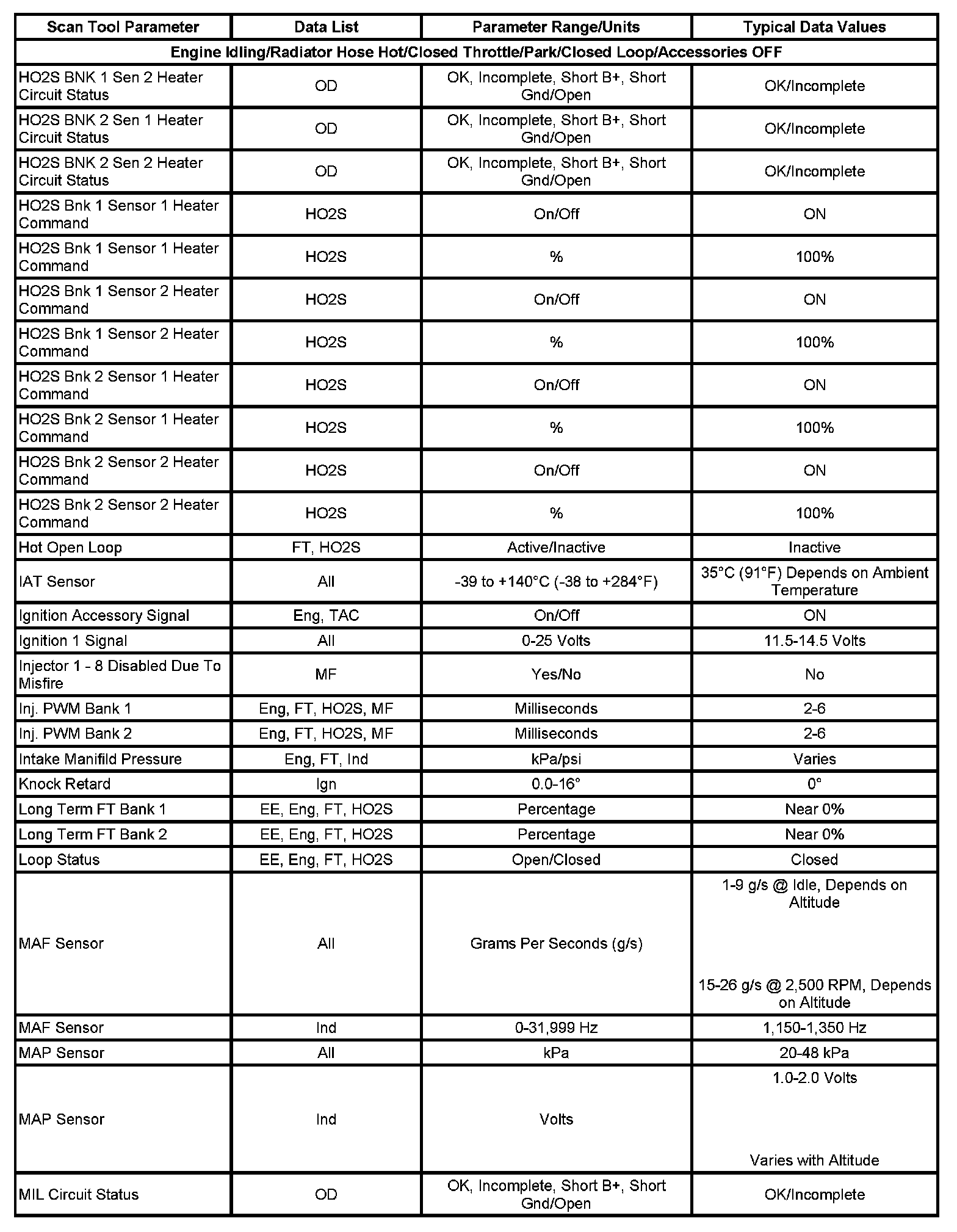 Scan tool values from a properly running engine may be used for comparison with the engine you are diagnosing. The Engine Scan Tool Data List represents values that would be seen on a normal running engine.