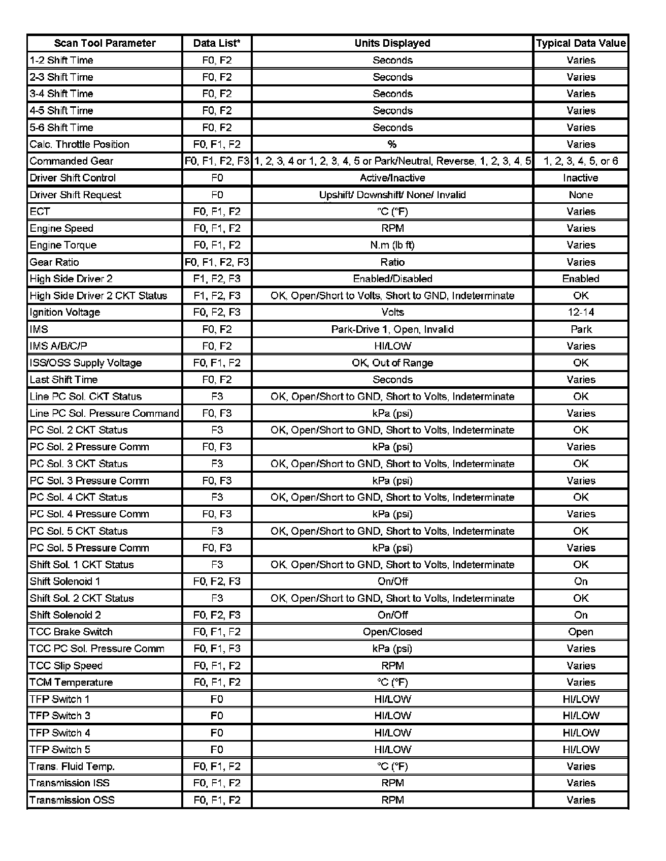 Only the parameters listed below are used in this manual for diagnosing. If a scan tool displays other parameters, the values are not recommended by General Motors for use in diagnosis.