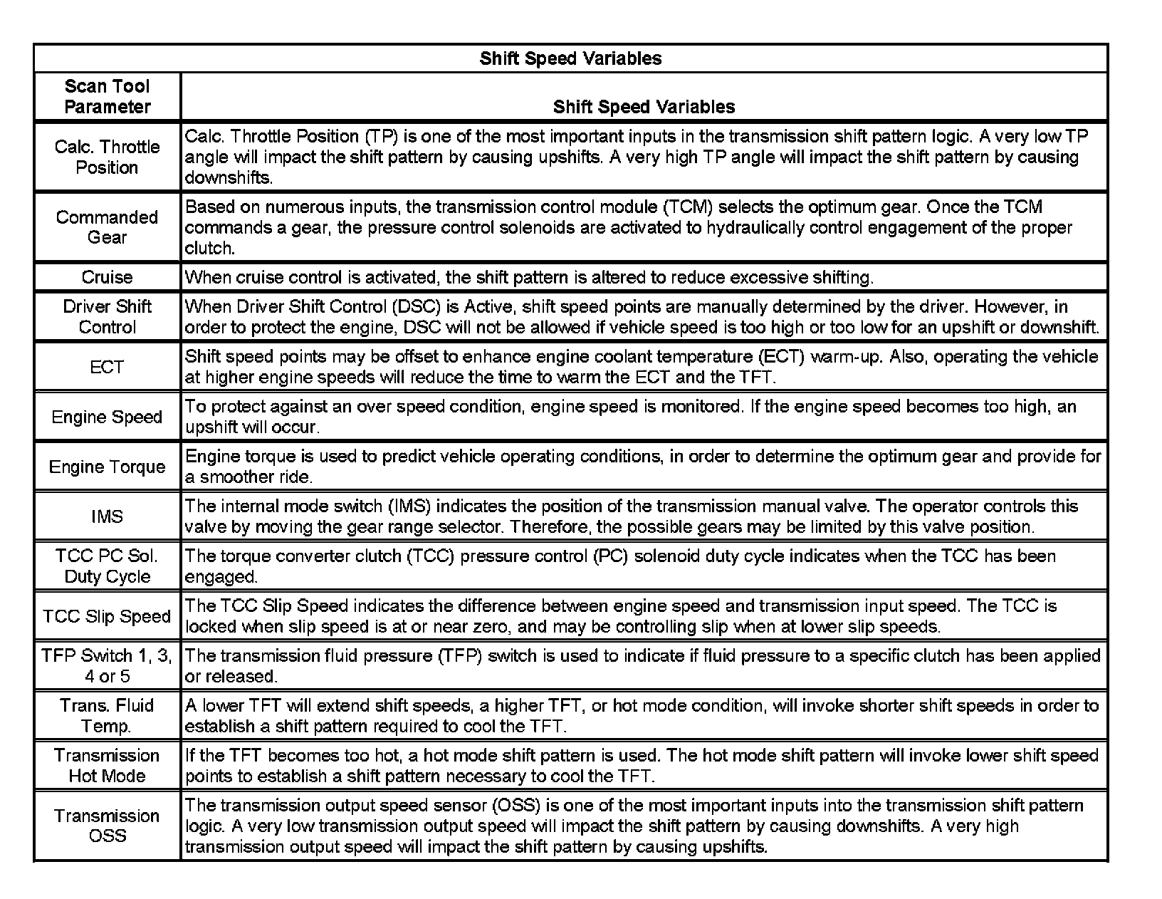 Important: Shift speed points are affected by many different vehicle and transmission operating conditions. The table above represents shift speed points calibrated at specific throttle angles during normal operating conditions and a temperature range between 0-130°C (32-266°F). These shift speed points are also based on an axle ratio of 2.56, and assume a production-intent tire size. The table below illustrates a number of different variables that influence these shift speed points. Based on a given operating condition, these variables may override the normal shift speed points. To assist in monitoring the different variables, the respective scan tool data parameter is also listed.