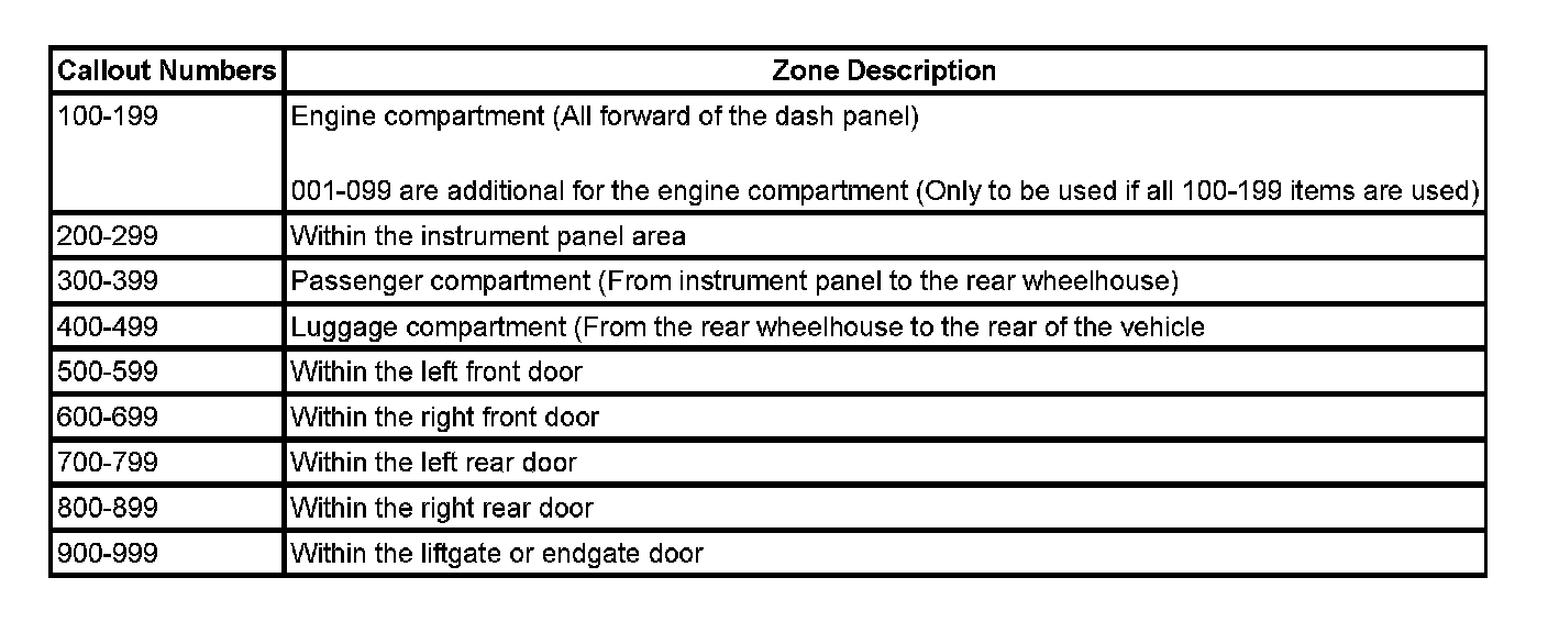 All grounds, in-line connectors, pass-through grommets, and splices have identifying numbers that correspond to where they are located in the vehicle. The table explains the numbering system.