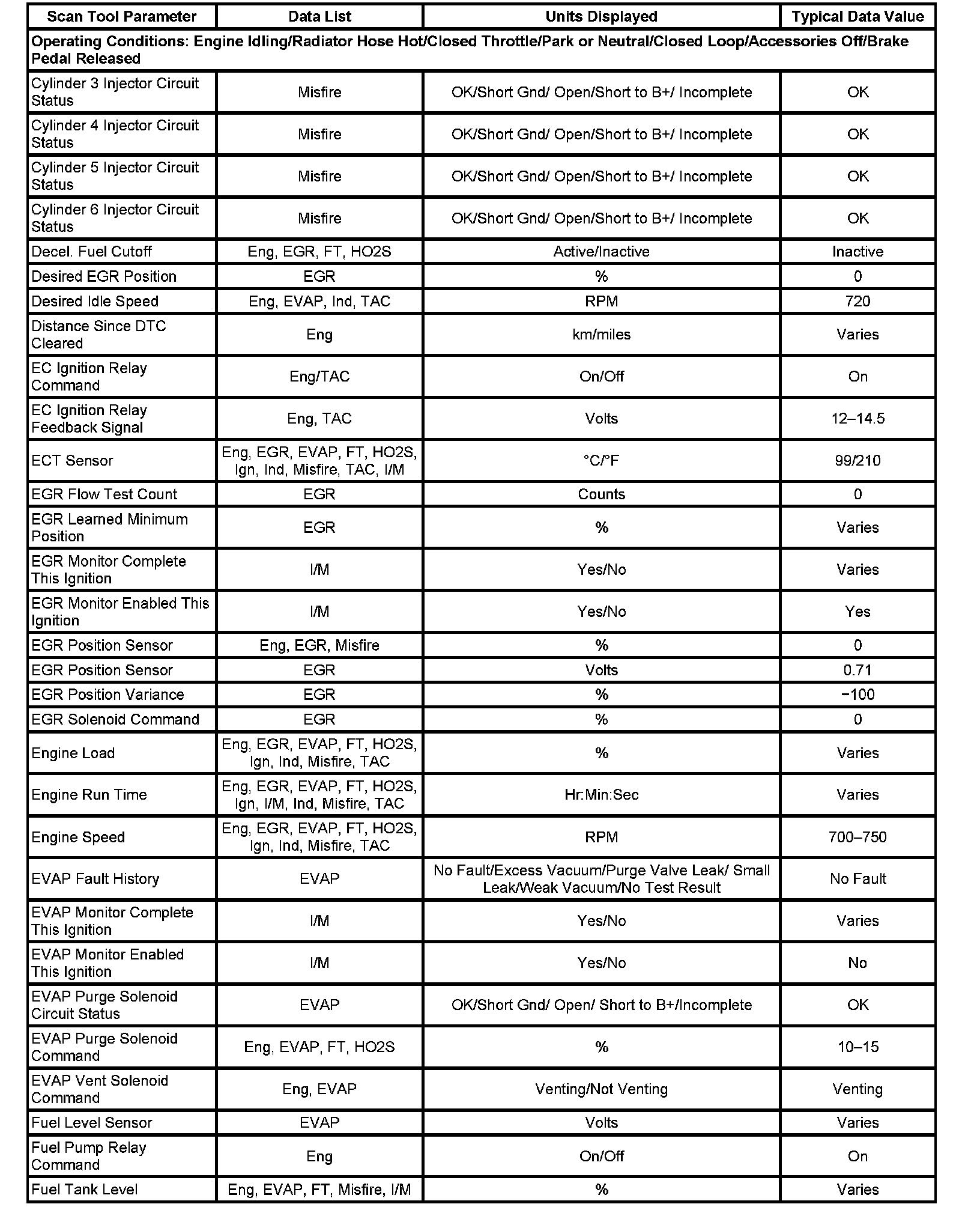 The scan tool values from a properly running engine may be used for comparison with the engine you are diagnosing. The Engine Scan Tool Data List represents values that would be seen on a normally running engine.