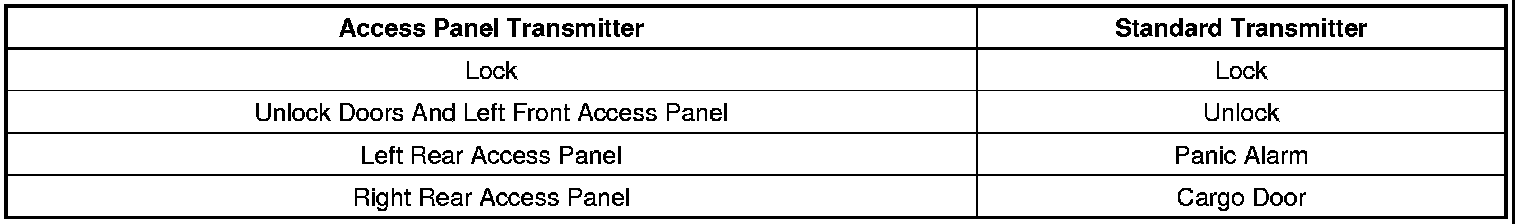 - Unlock Doors And Left Front Access Panel: Press this button once to unlock all of the doors. Press this button again within five seconds to open the left front access panel.