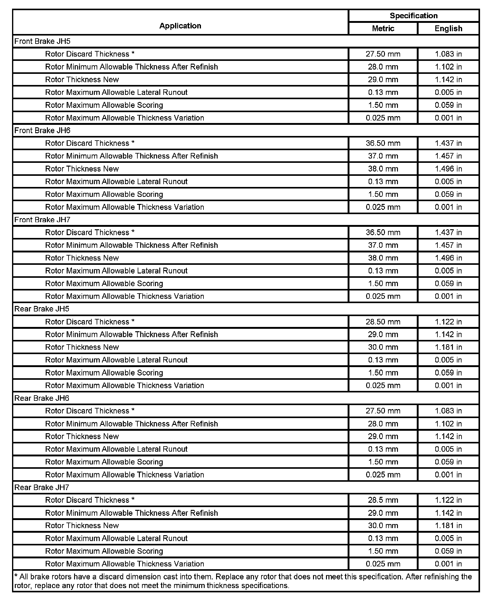 Disc Brake Component Specifications: