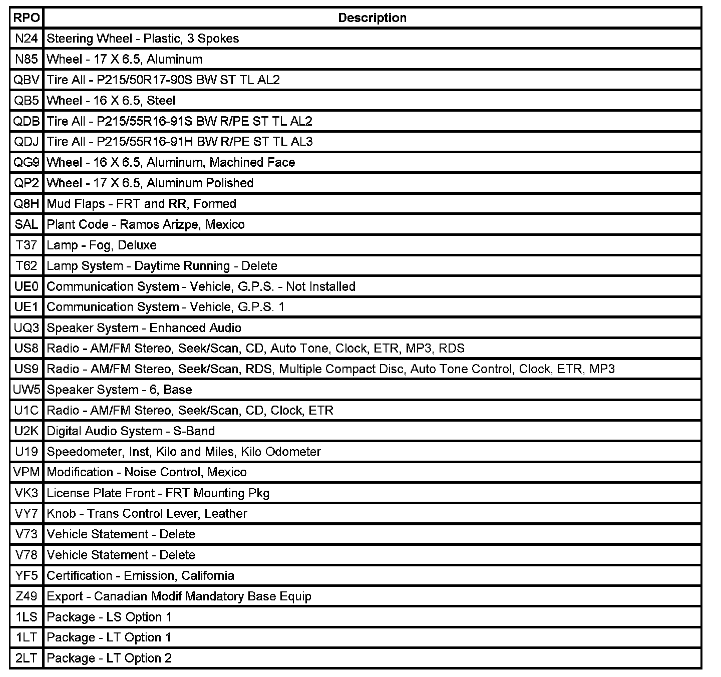 RPO Code List
