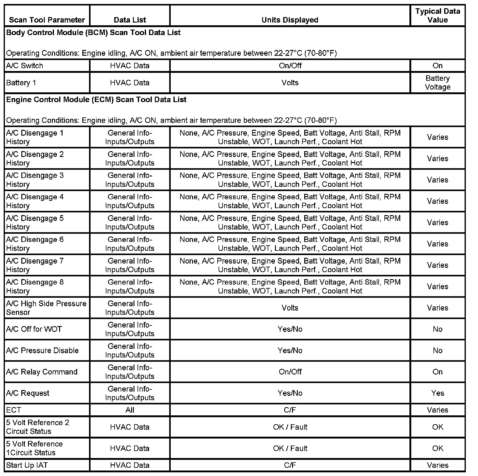 The scan tool data values were taken from a known good vehicle under the following conditions: