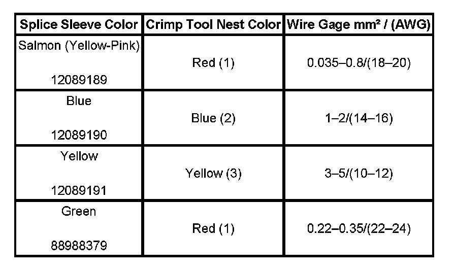 4. Select the proper DuraSeal splice sleeve according to the wire size. Refer to the above table at the beginning of the repair procedure for the color coding of the DuraSeal splice sleeves and the crimp tool nests.