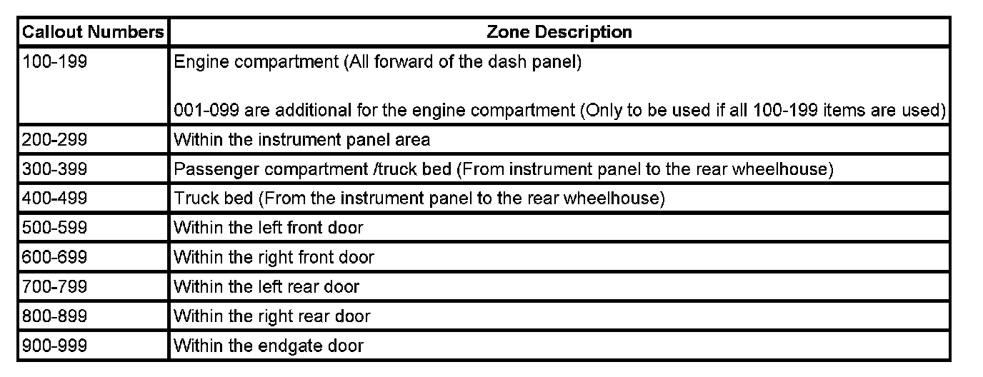 All grounds, in-line connectors, pass-through grommets, and splices have identifying numbers that corresponds to where they are located in the vehicle. The table explains the numbering system.