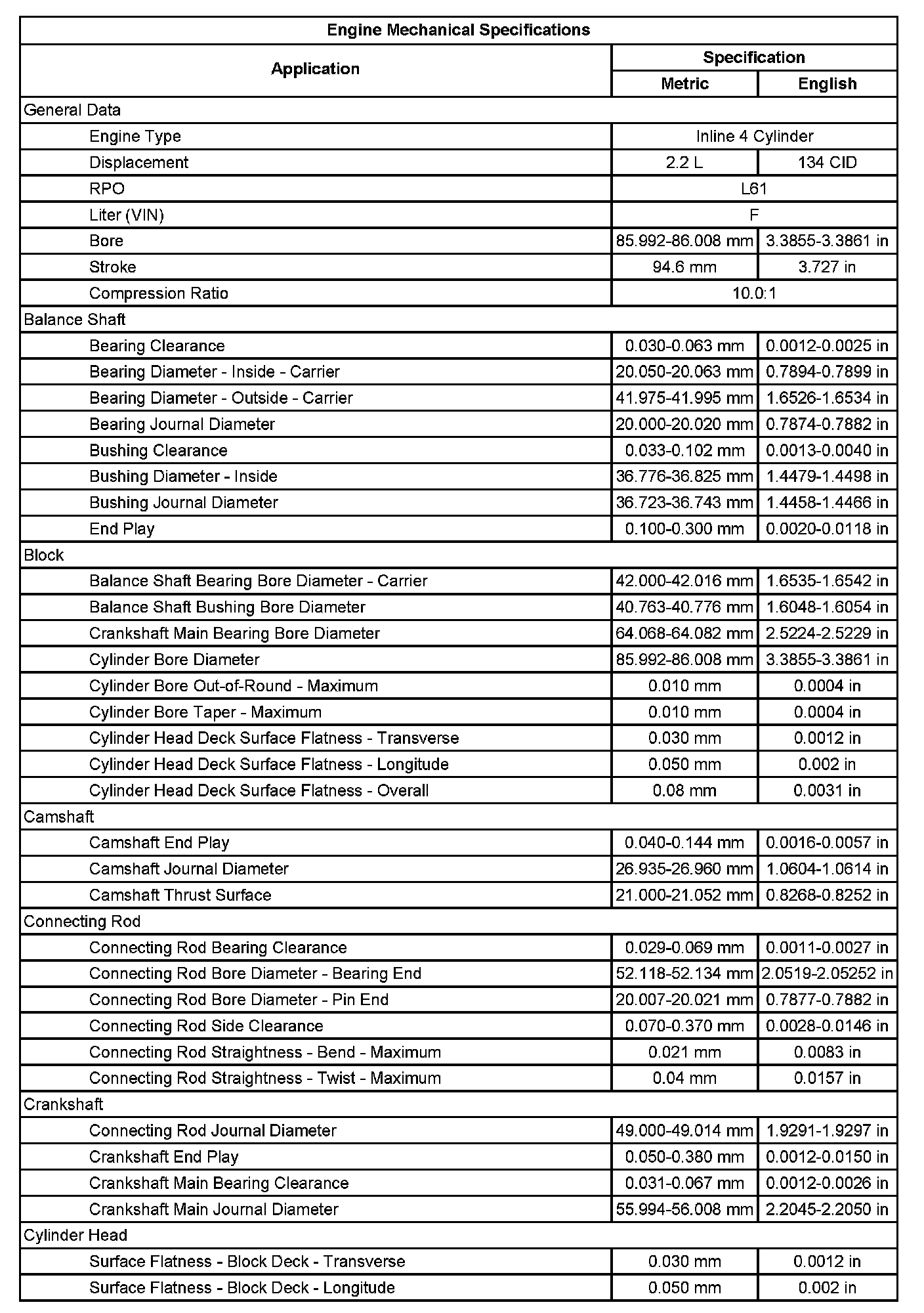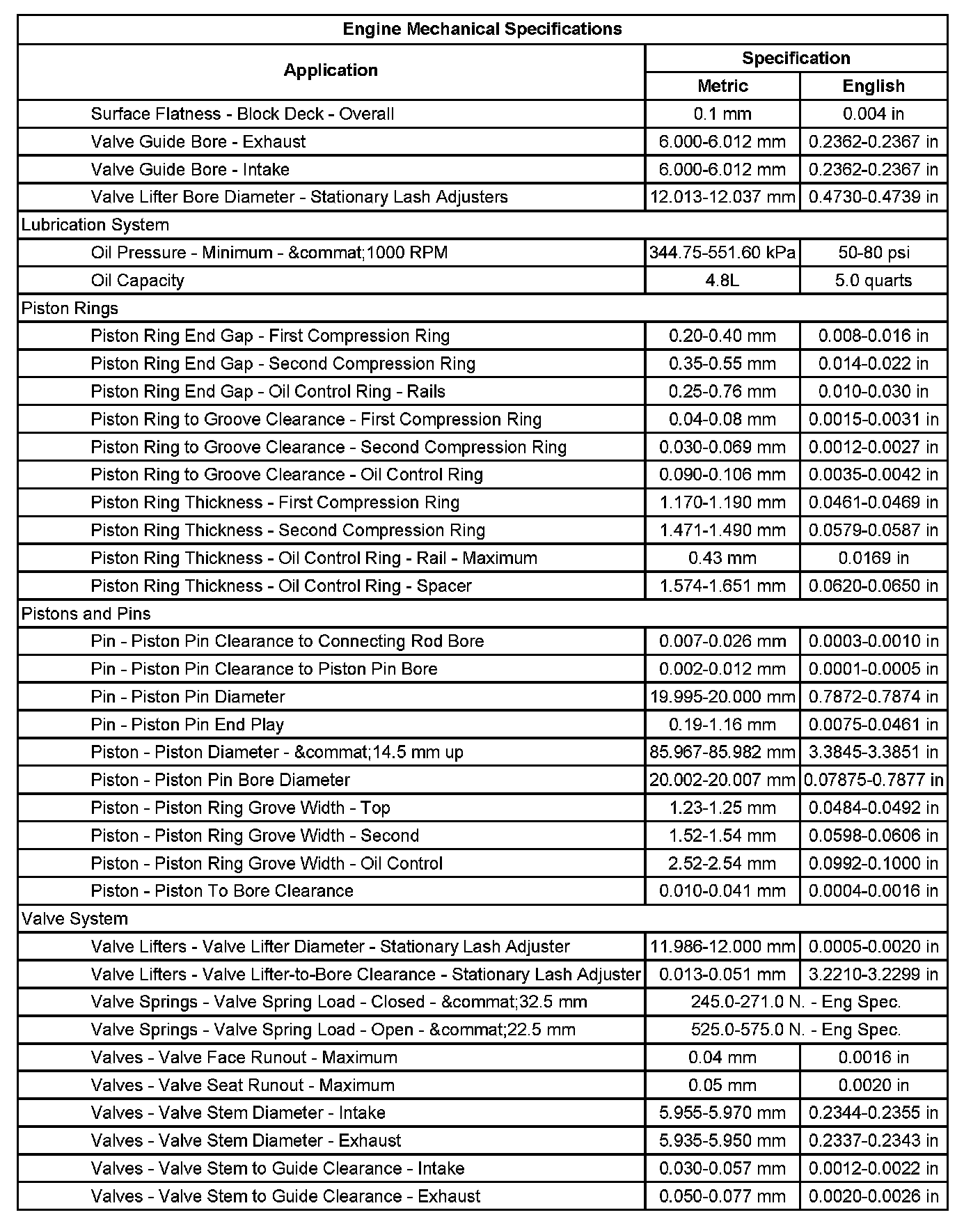 Engine Mechanical Specifications