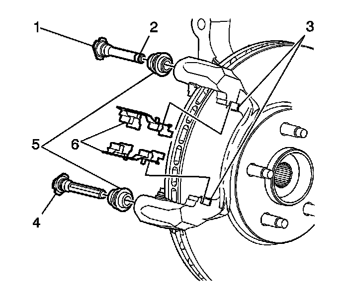 1. Apply a thin, light coating of high temperature silicone brake lubricant to the inside of the brake caliper guide pin boots (5).