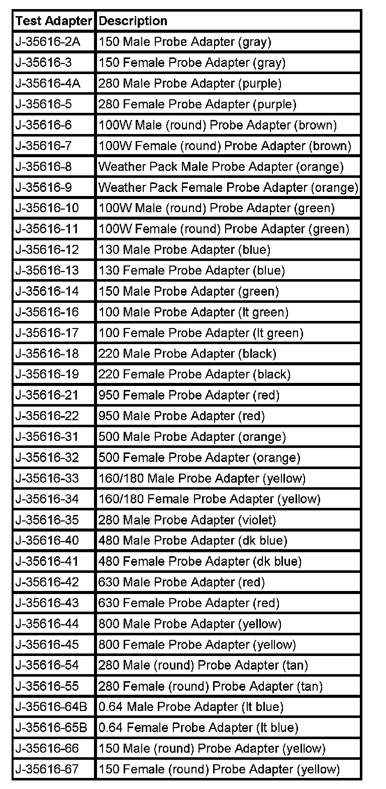 IMPORTANT: When probing female 0.64 terminals, it is important to use the correct adapter. There have been some revisions to the test adapter for 0.64 terminals. The proper adapter for 0.64 terminals is the J 35616-64B which has a gold terminal and a black wire between the base and tip. Failure to use the proper test adapter may result in damage to the terminal being tested and improper diagnosis.