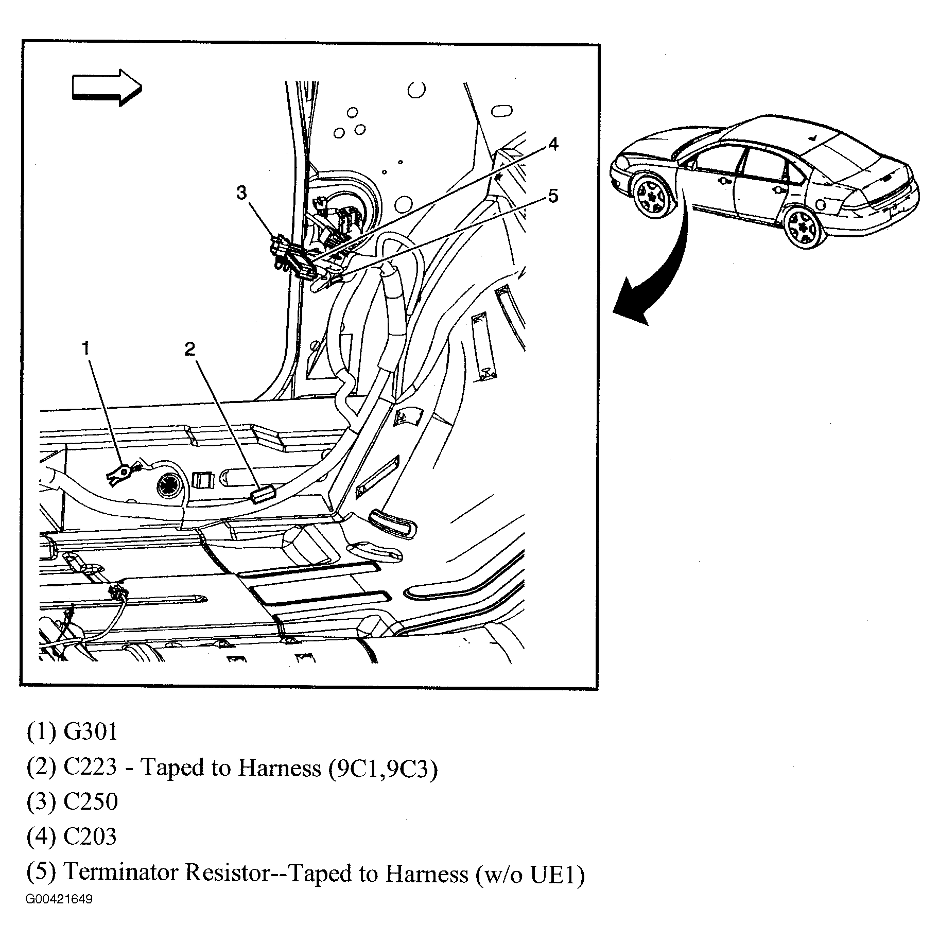 | Terminator Resistor (W/O GPS) | In body harness, near connector C203. See Figure. |