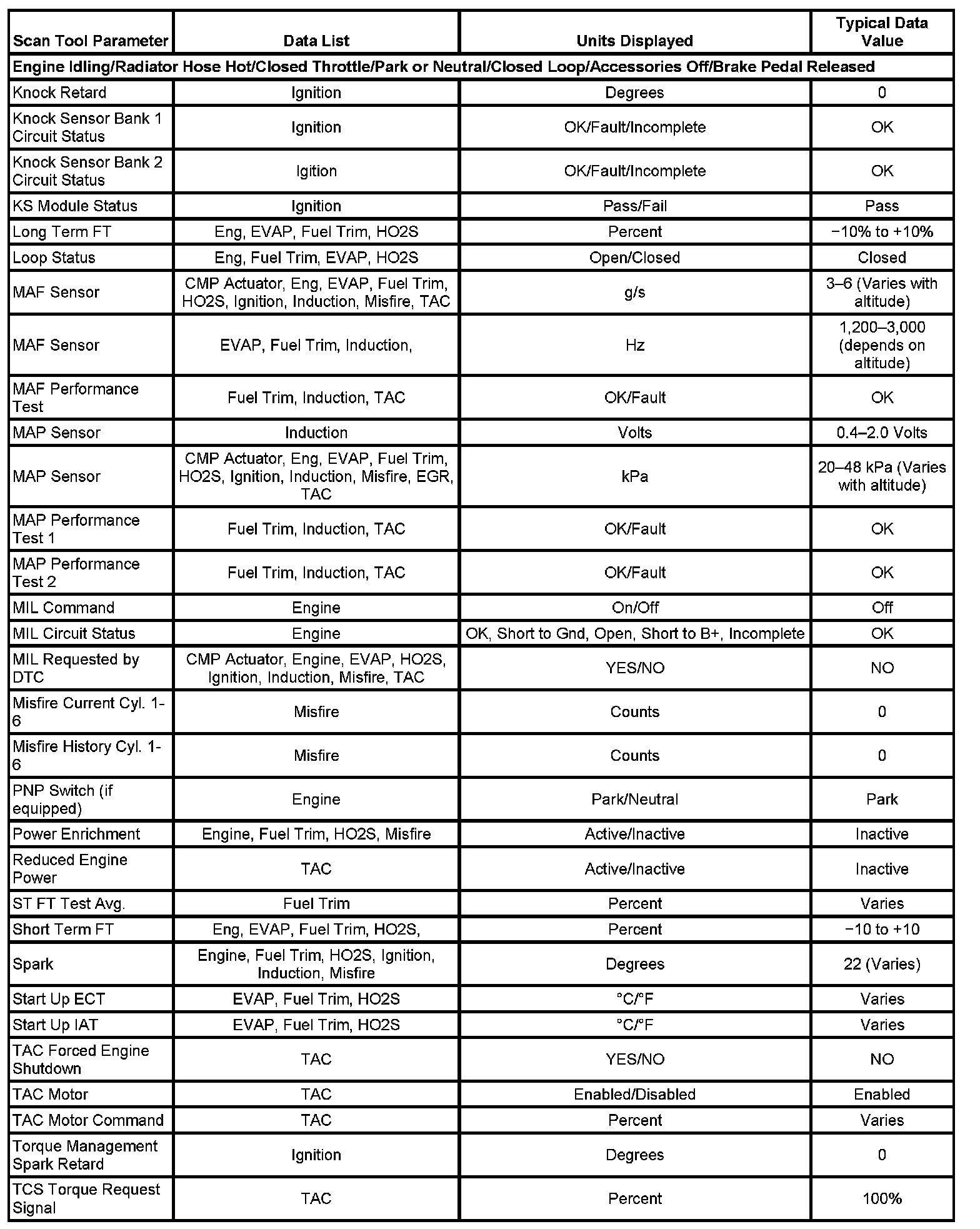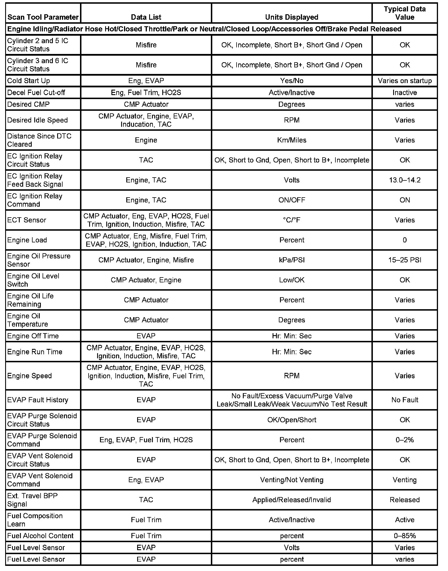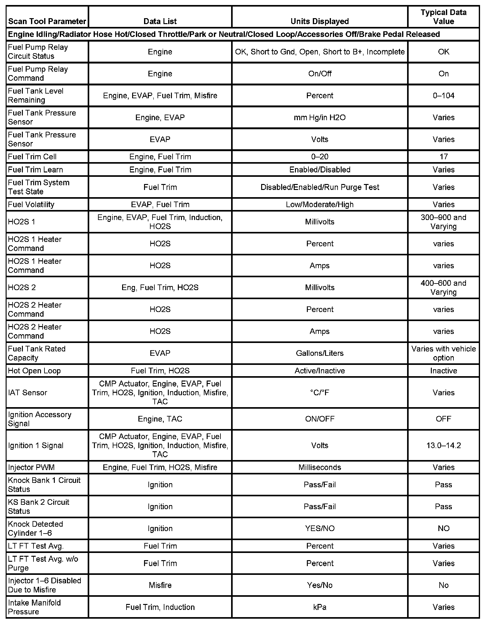 The scan tool values from a properly running engine may be used for comparison with the engine you are diagnosing. The Engine Scan Tool Data List represents values that would be seen on a normally running engine.
