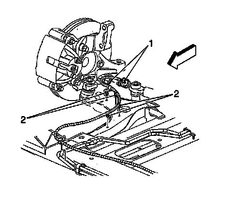 2.Remove both front wheel speed harness retainers (2) from the frame and the lower control arms, if equipped.