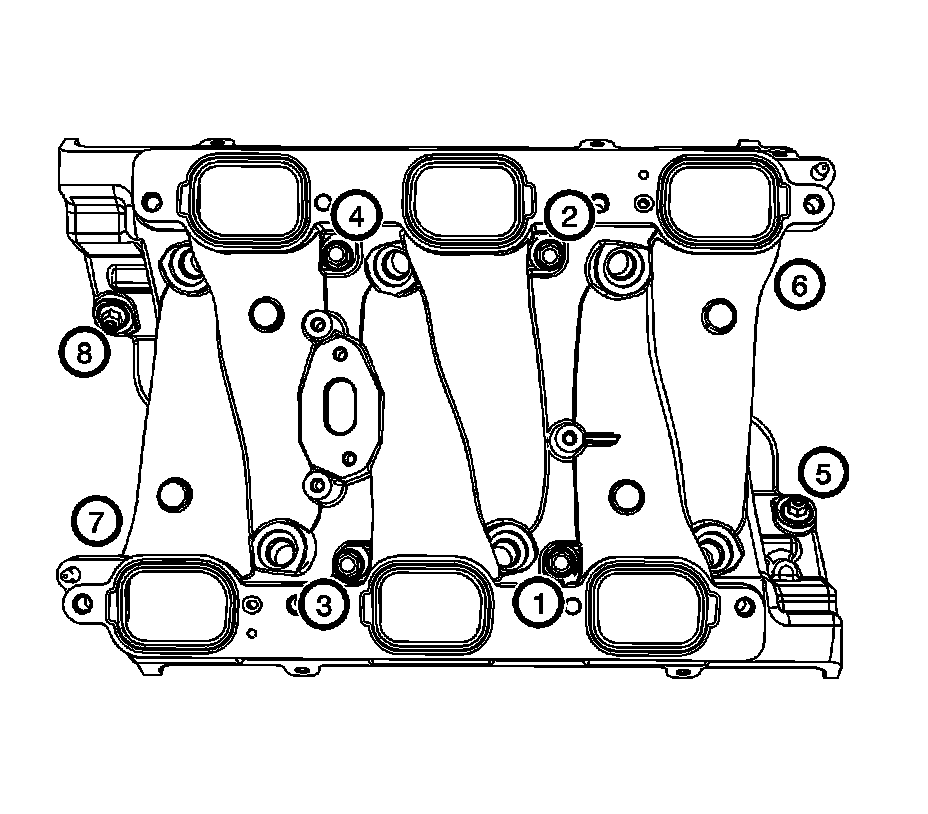Tighten the lower intake manifold bolts (1, 2, 3, 4, 5, 8, 6, 7, 8) in sequence to 7 N.m (62 lb in).