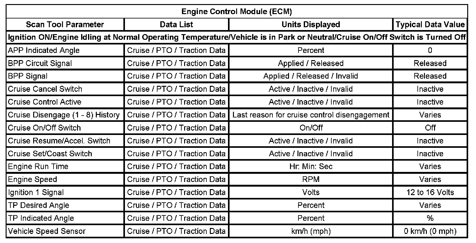 The scan tool data lists contain all of the cruise control related parameters that are available on the scan tool. The parameters in the list are arranged in alphabetical order. The data list column indicates the location of the parameter within the scan tool menu selections.