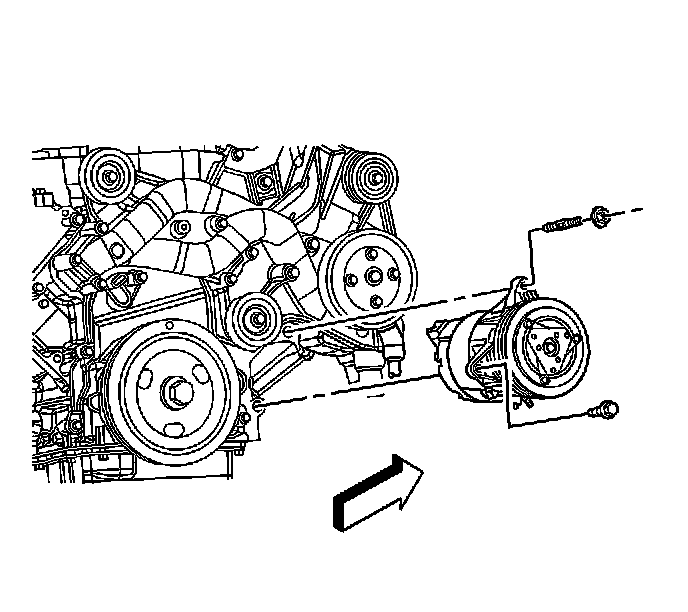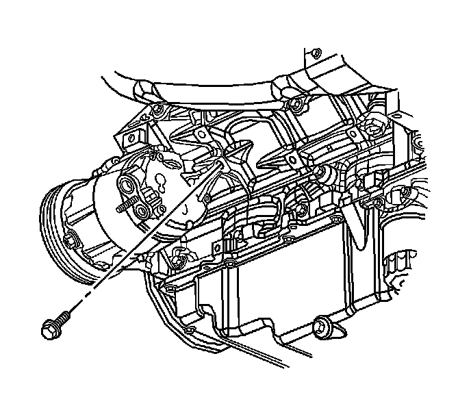 Important: Install the A/C compressor ensuring that the back of the A/C compressor is inserted onto the bolt. Do not tighten the bolt at this time.