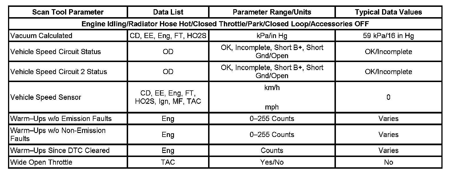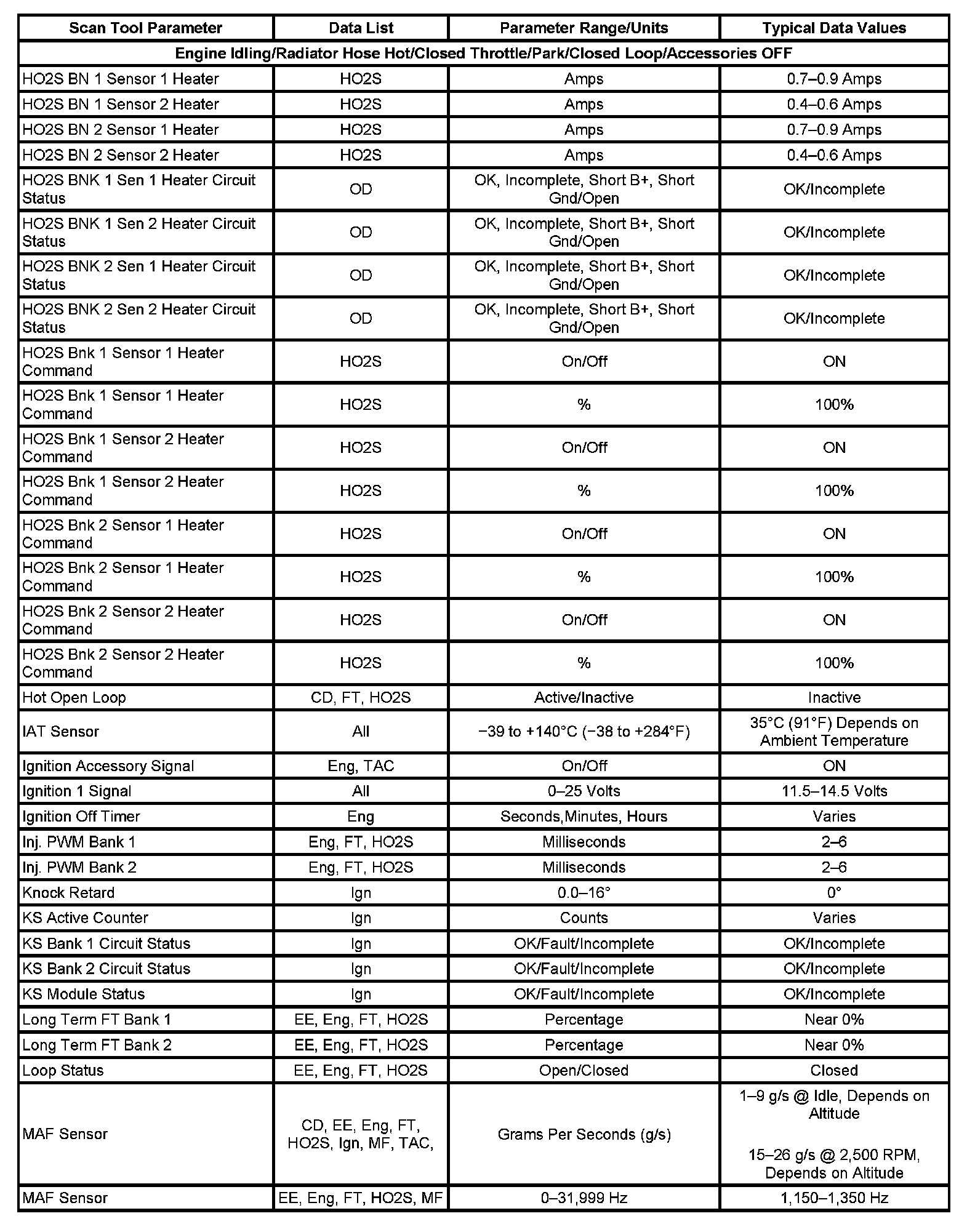 Scan tool values from a properly running engine may be used for comparison with the engine you are diagnosing. The Engine Scan Tool Data List represents values that would be seen on a normal running engine at idle.