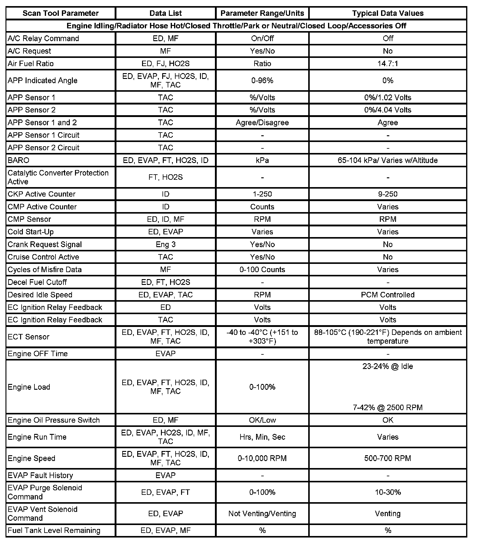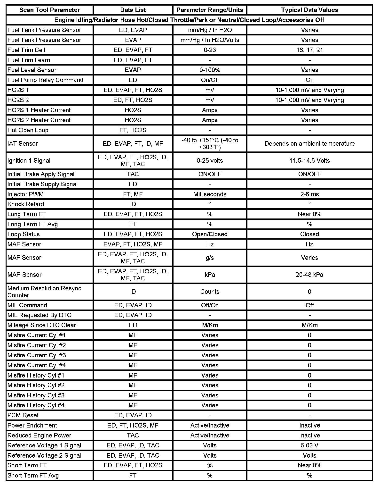 The Engine Scan Tool Data List contains all engine related parameters that are available on the scan tool. The list is arranged in alphabetical order. A given parameter may appear in any one of the data lists, and in some cases may appear more than once, or in more than one data list in order to group certain related parameters together.