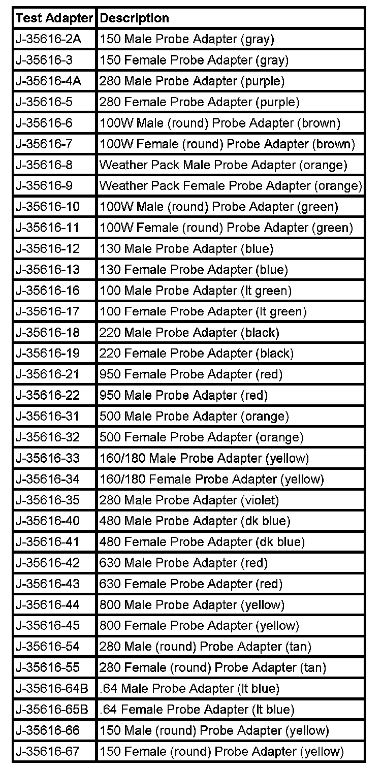 Important: When probing female 0.64 terminals, it is important to use the correct adapter. There have been some revisions to the test adapter for 0.64 terminals. The proper adapter for 0.64 terminals is the J 35616-64A which has a tin terminal and a blue wire between the base and tip. Failure to use the proper test adapter may result in damage to the terminal being tested and improper diagnosis.