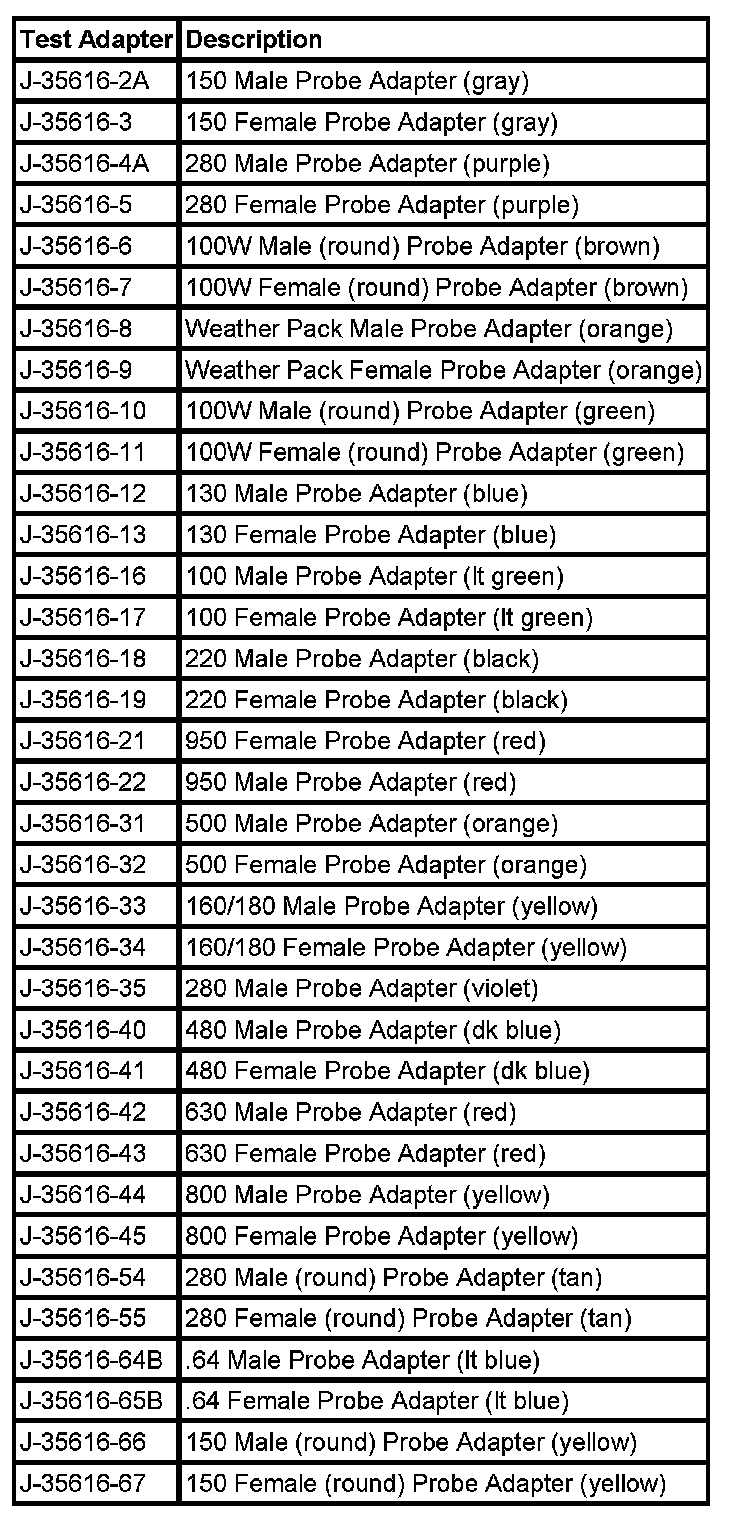 Important: When probing female 0.64 terminals, it is important to use the correct adapter. There have been some revisions to the test adapter for 0.64 terminals. The proper adapter for 0.64 terminals is the J 35616-64B which has a gold terminal and a black wire between the base and tip. Failure to use the proper test adapter may result in damage to the terminal being tested and improper diagnosis.