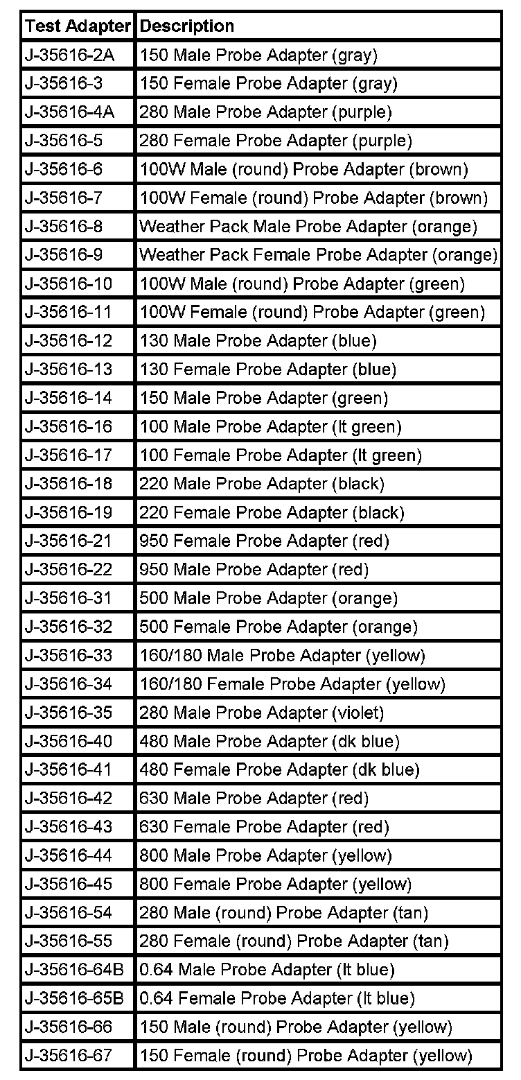 Important: When probing female 0.64 terminals, it is important to use the correct adapter. There have been some revisions to the test adapter for 0.64 terminals. The proper adapter for 0.64 terminals is the J35616-64B which has a gold terminal and a black wire between the base and tip. Failure to use the proper test adapter may result in damage to the terminal being tested and improper diagnosis.