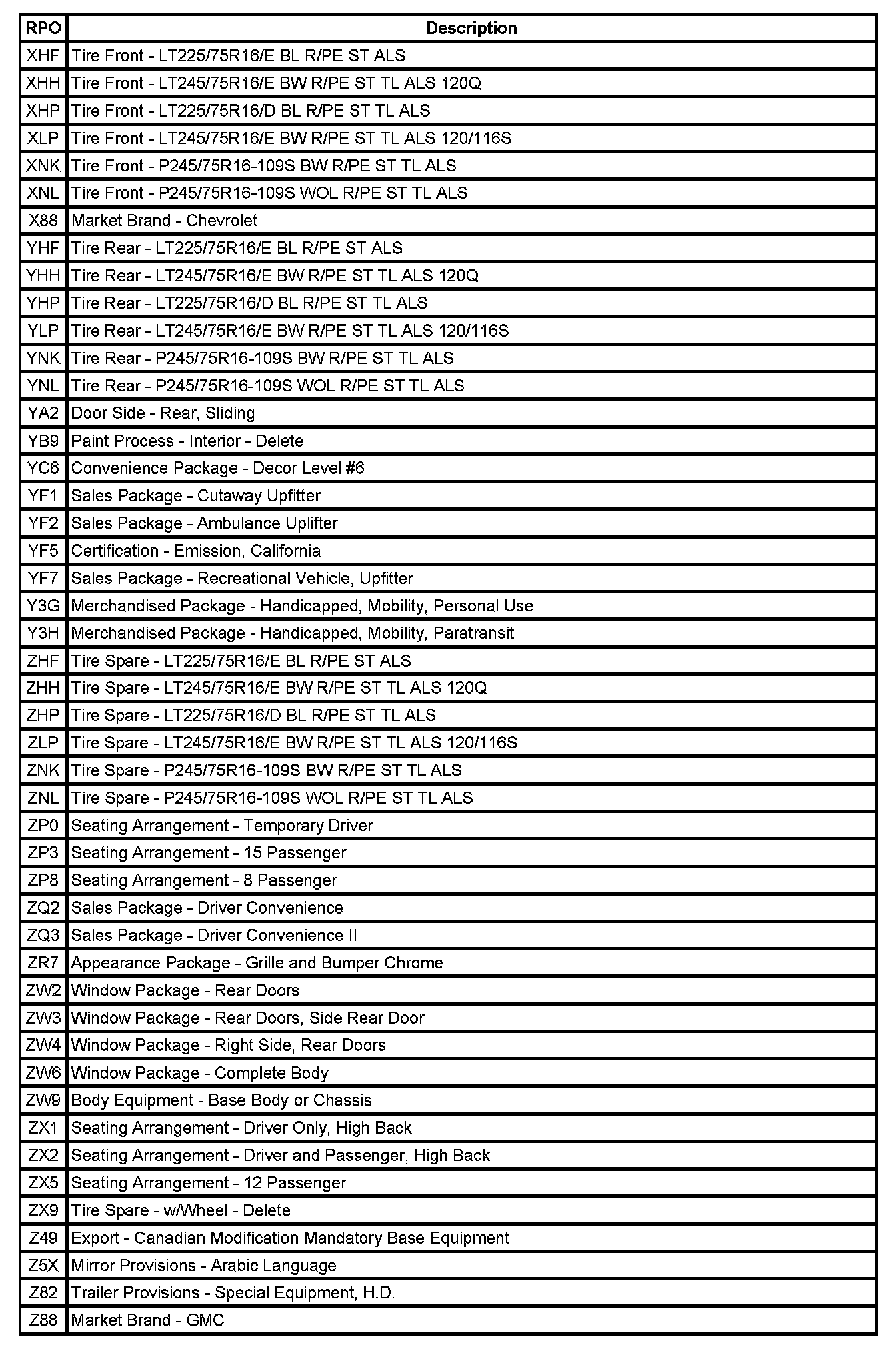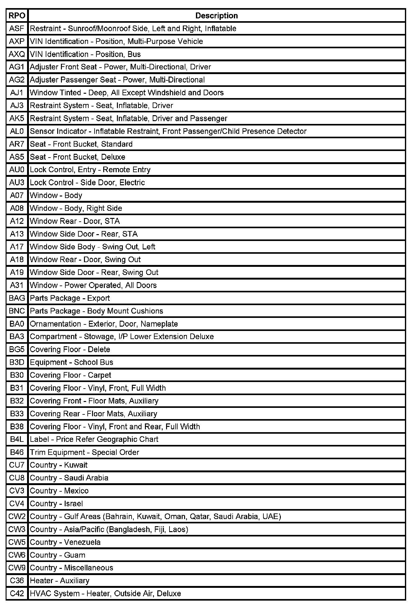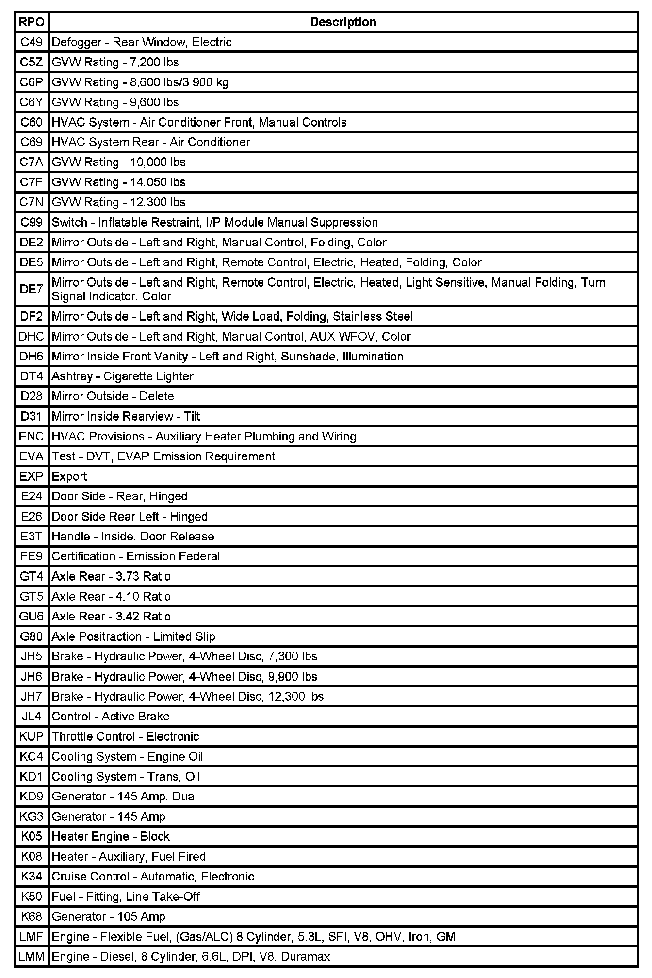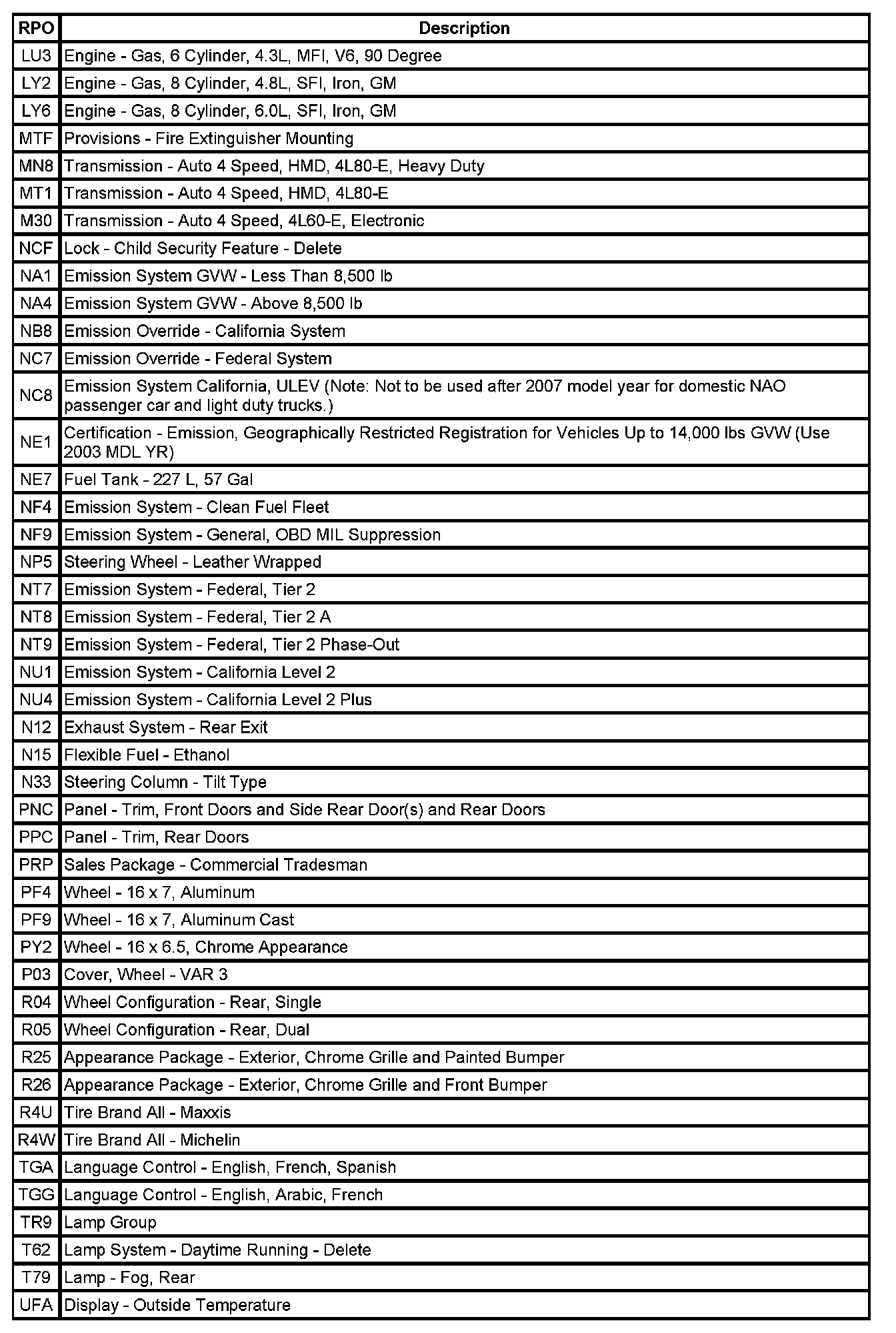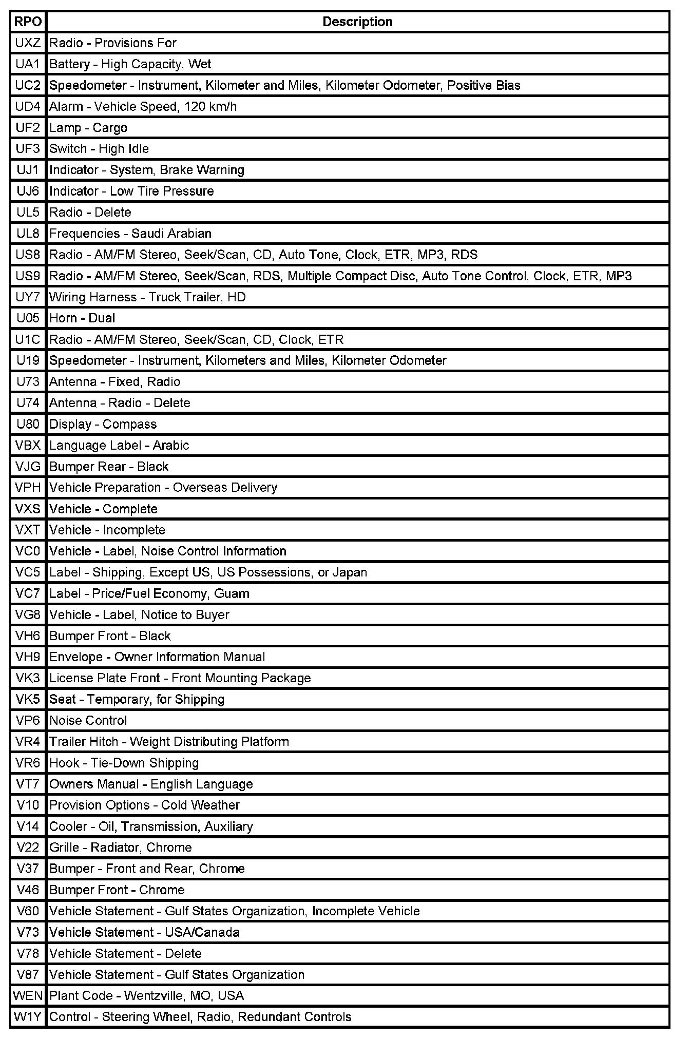 The production/process codes provide the description of the regular production options (RPOs). The RPO list is printed on the Service Parts Identification Label.