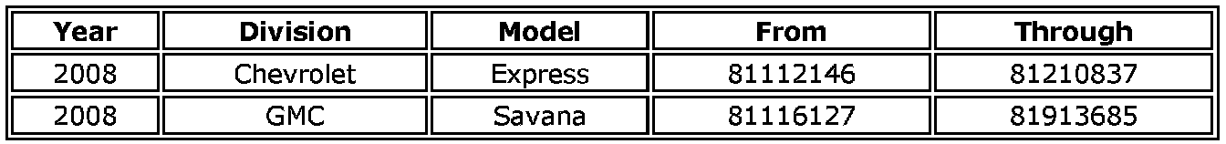 Involved are certain 2008 model year Chevrolet Express and GMC Savana G-Cutaway one way rental fleet and Cargo van model vehicles, equipped with a 4.8L or 6.0L (RPO LY2, LY6 - VIN C, K) V8 engine and 4L80E (RPO MT1) automatic transmission and 3.73/4.10 (RPO GT4, GT5) axle and 65 or 75 MPH (105 or 121 KPH) governor, and built within the VIN breakpoints shown above.