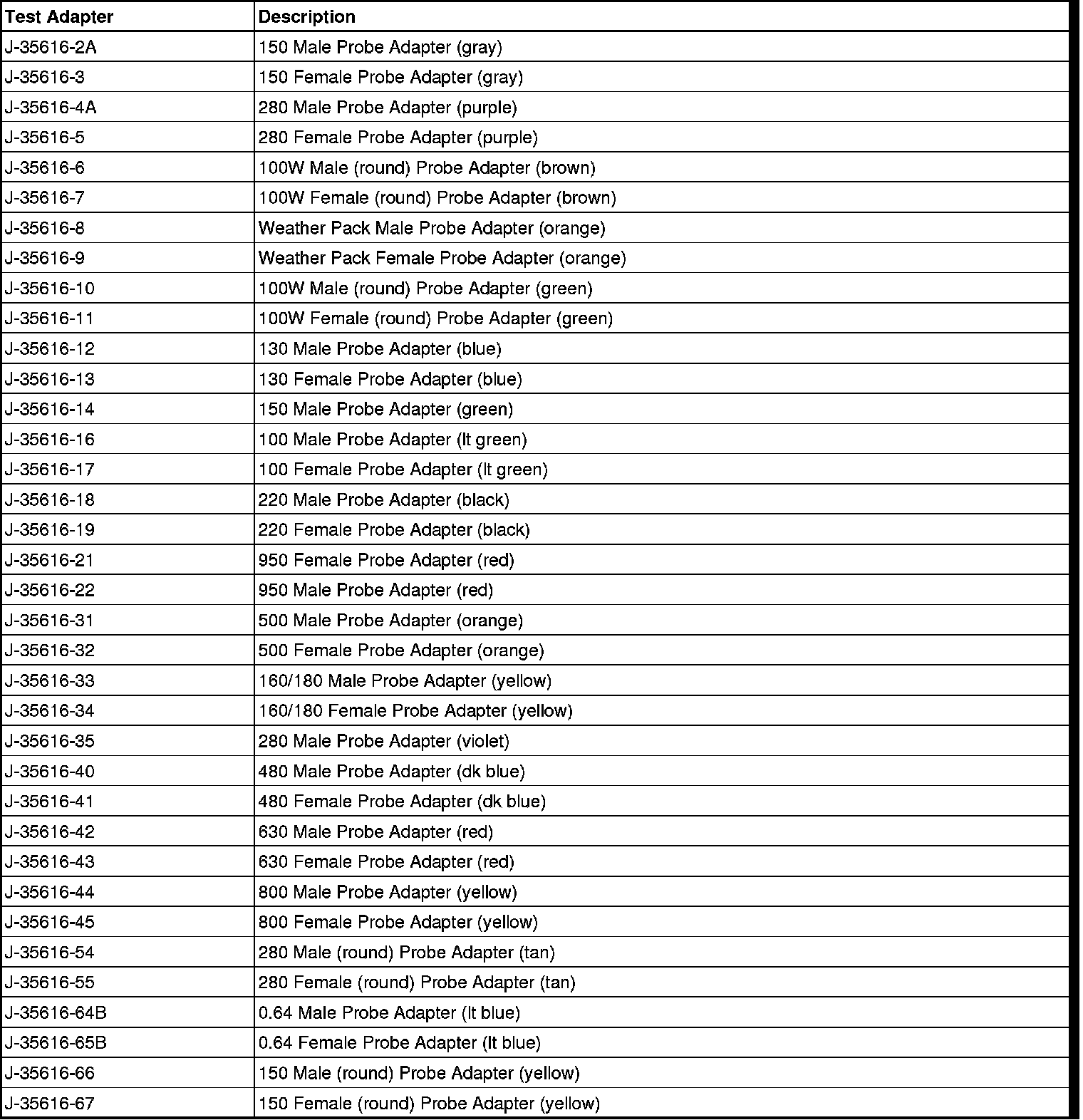 Important: When probing female 0.64 terminals, it is important to use the correct adapter. There have been some revisions to the test adapter for 0.64 terminals. The proper adapter for 0.64 terminals is the J 35616-64B which has a gold terminal and a black wire between the base and tip. Failure to use the proper test adapter may result in damage to the terminal being tested and improper diagnosis.