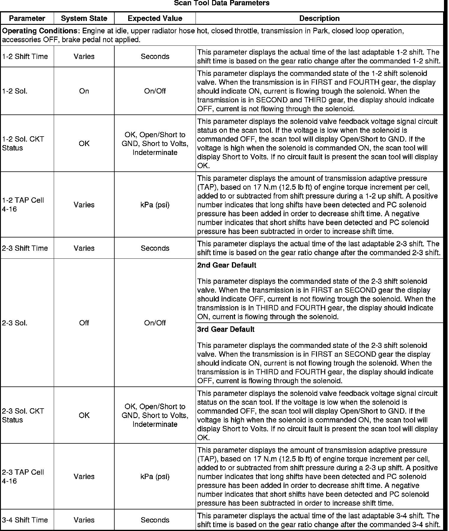 The scan tool values from a properly functioning transmission may be used for comparison with the transmission you are diagnosing. The values below represent a typical display recorded from a properly functioning system.