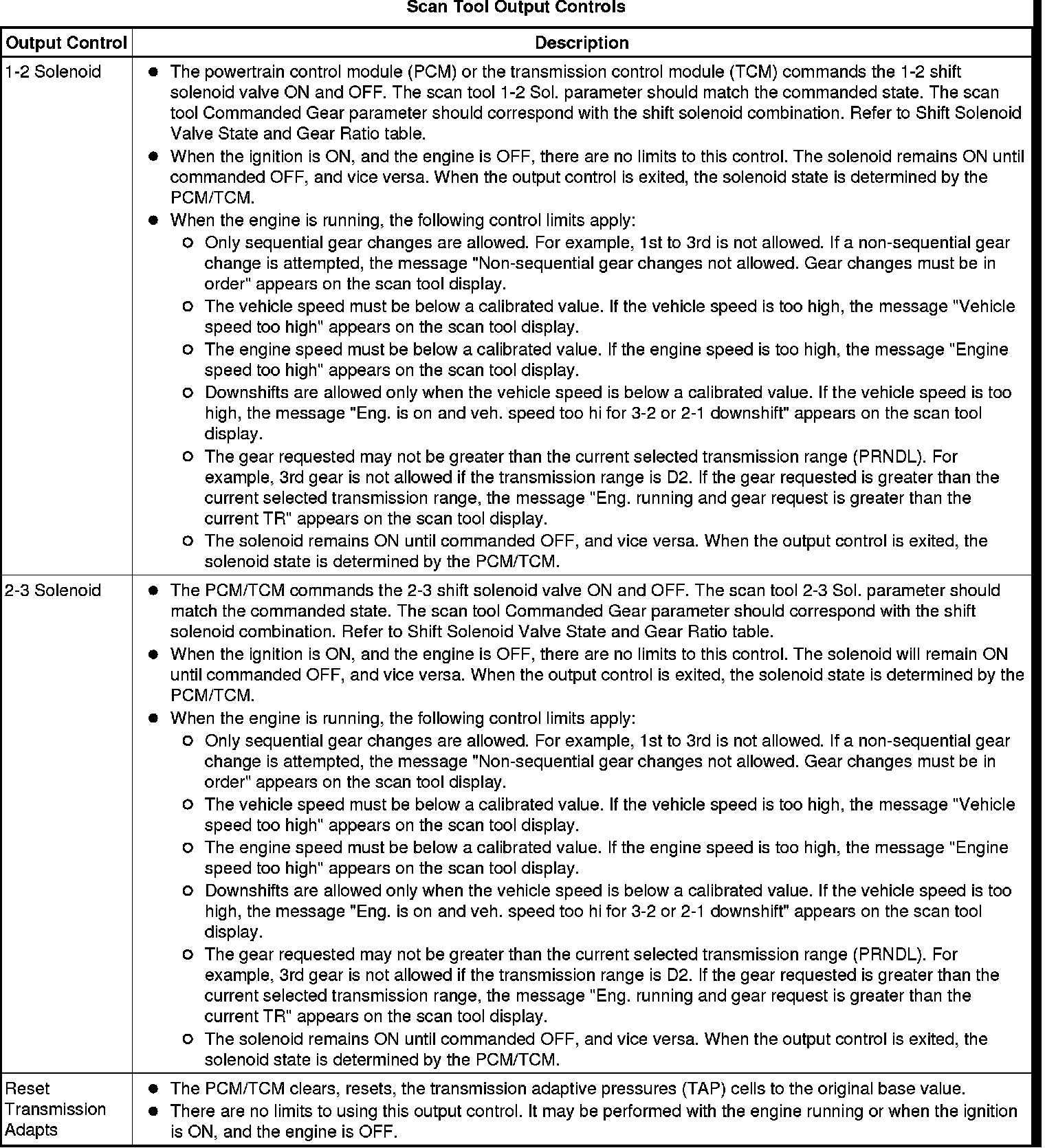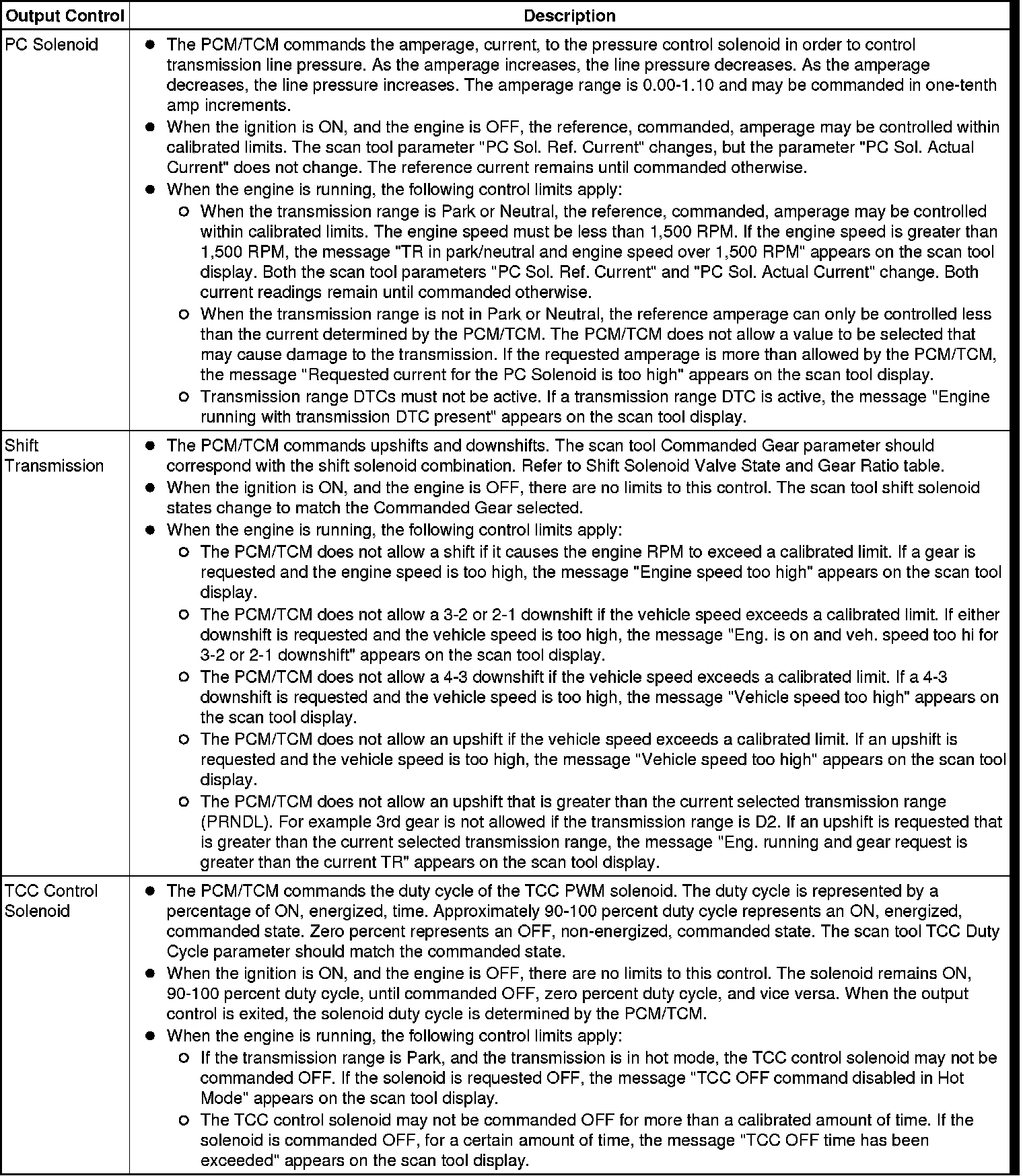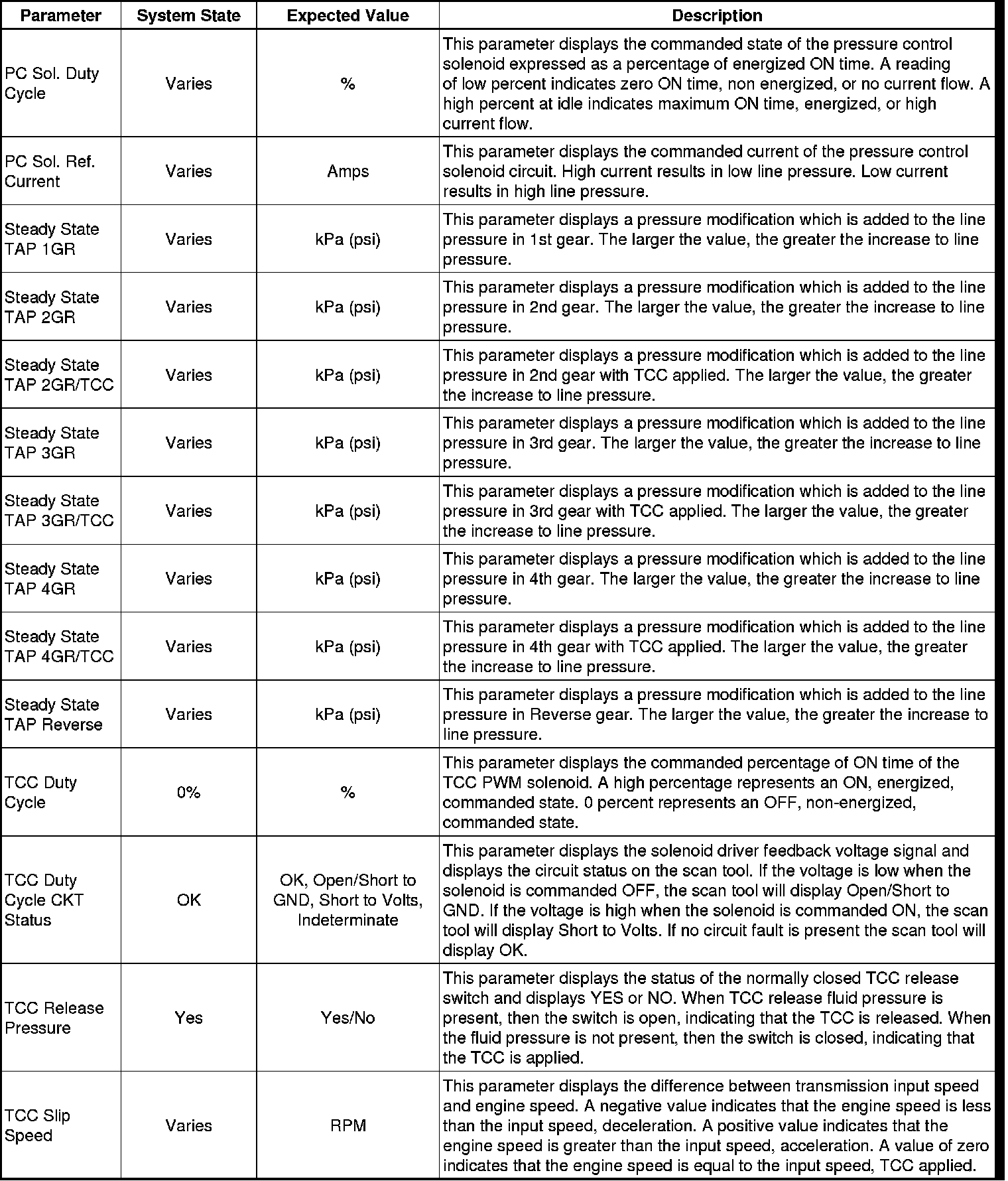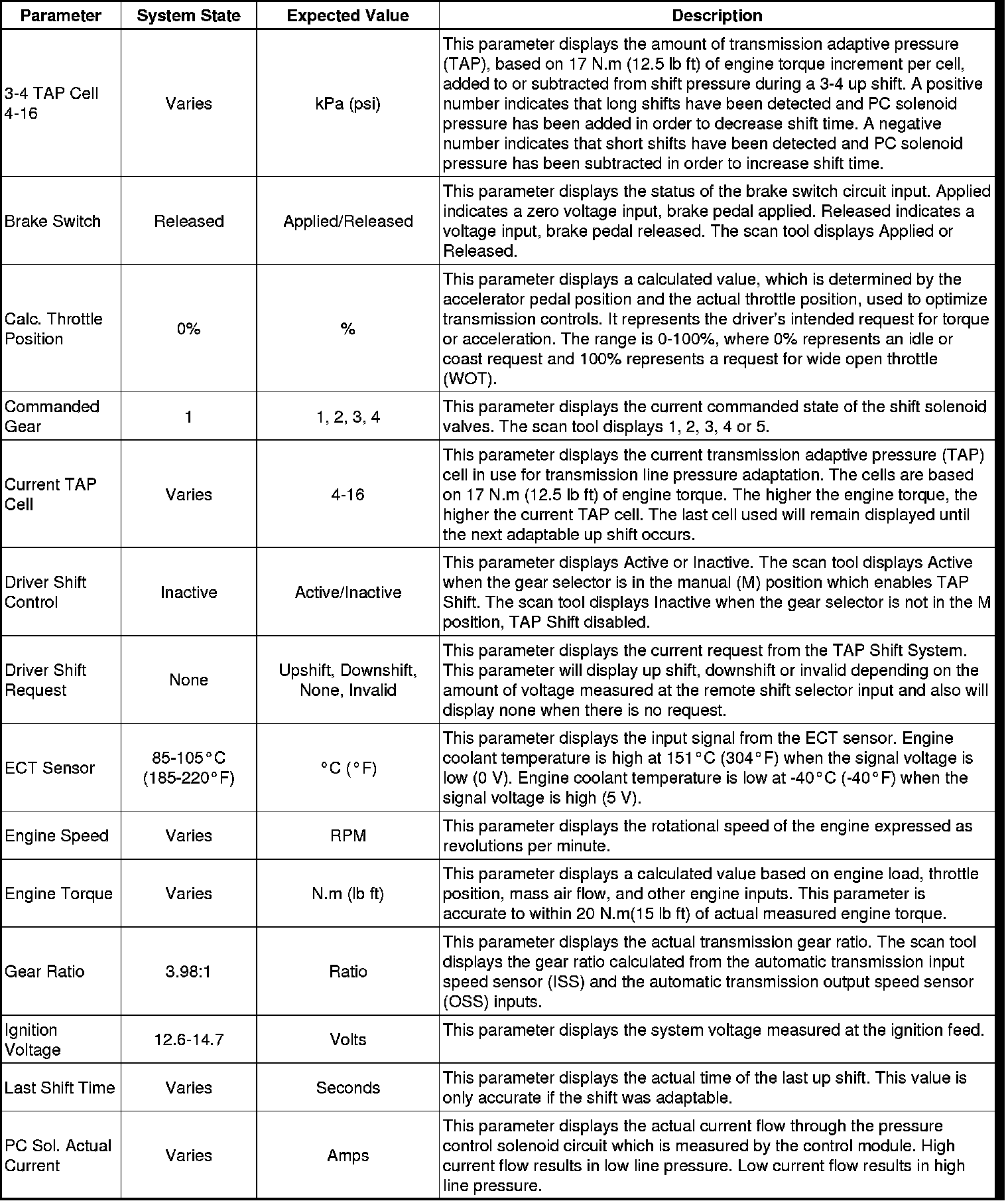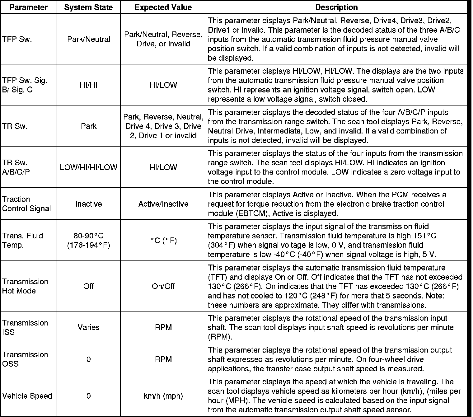 The Transmission Control Module Scan Tool Data List contains all transmission related parameters that are available on the scan tool. The list is arranged in alphabetical order. A given parameter may appear in any one of the data lists, and in some cases may appear more than once, or in more than one data list in order to group certain related parameters together.