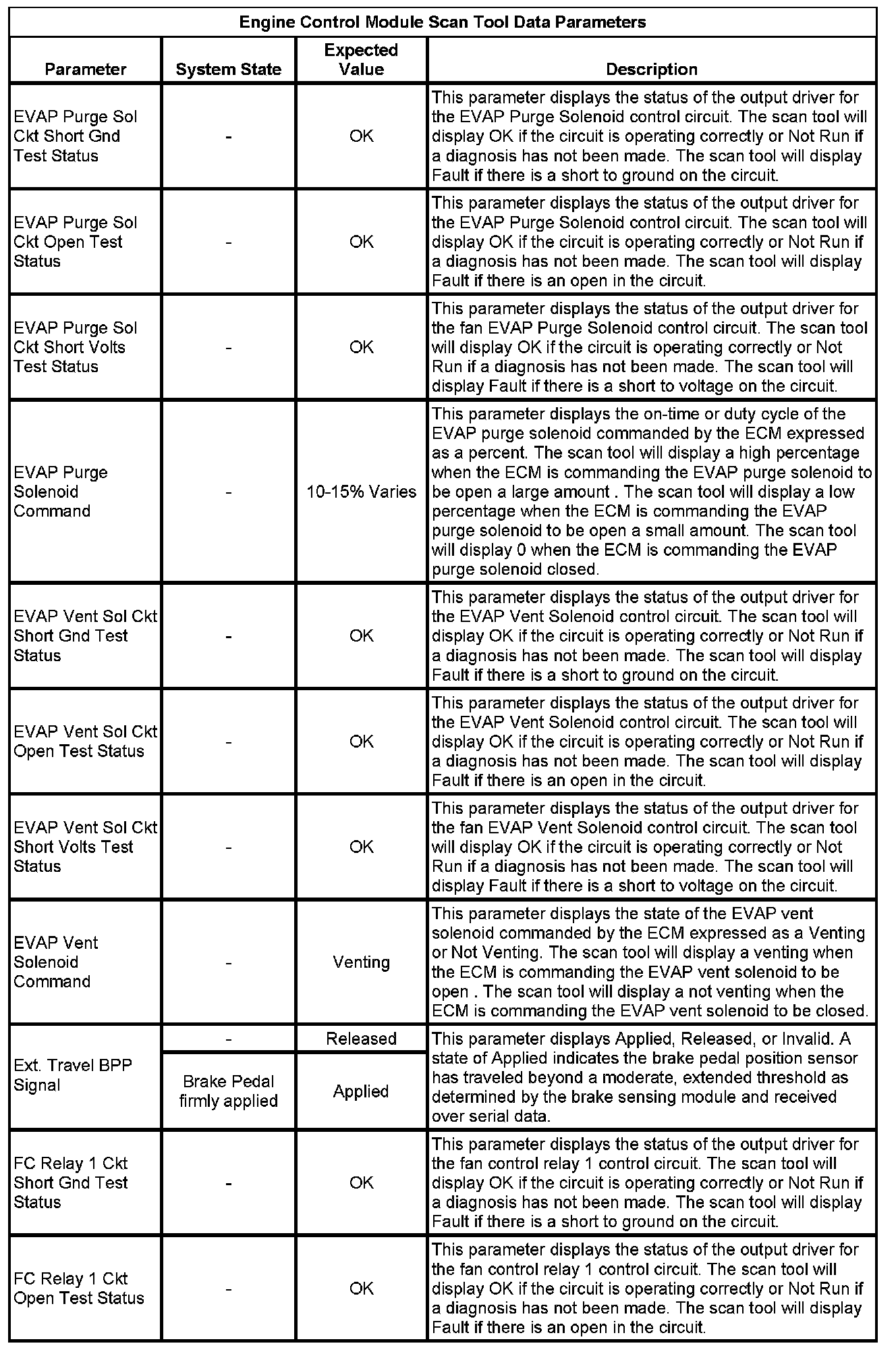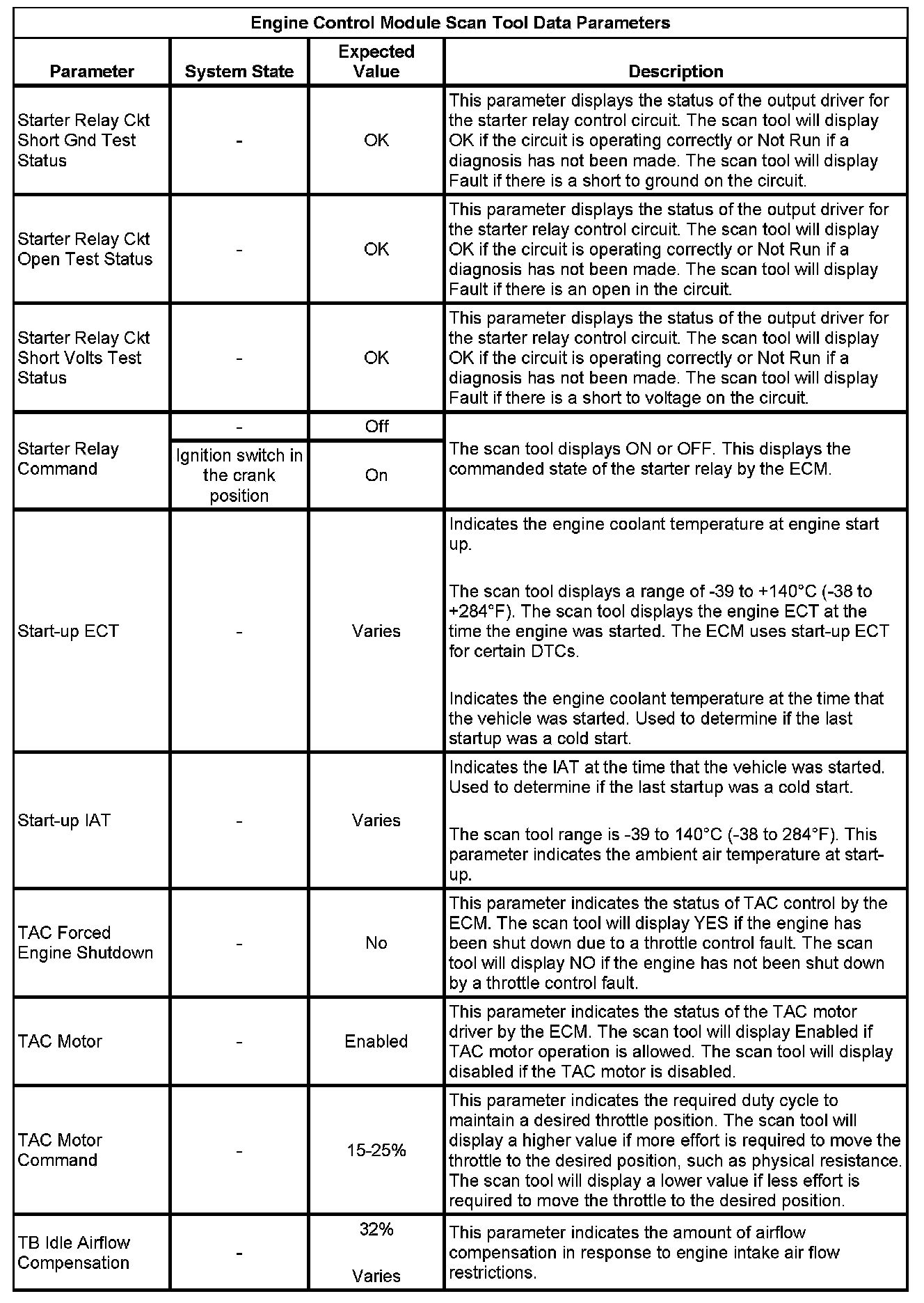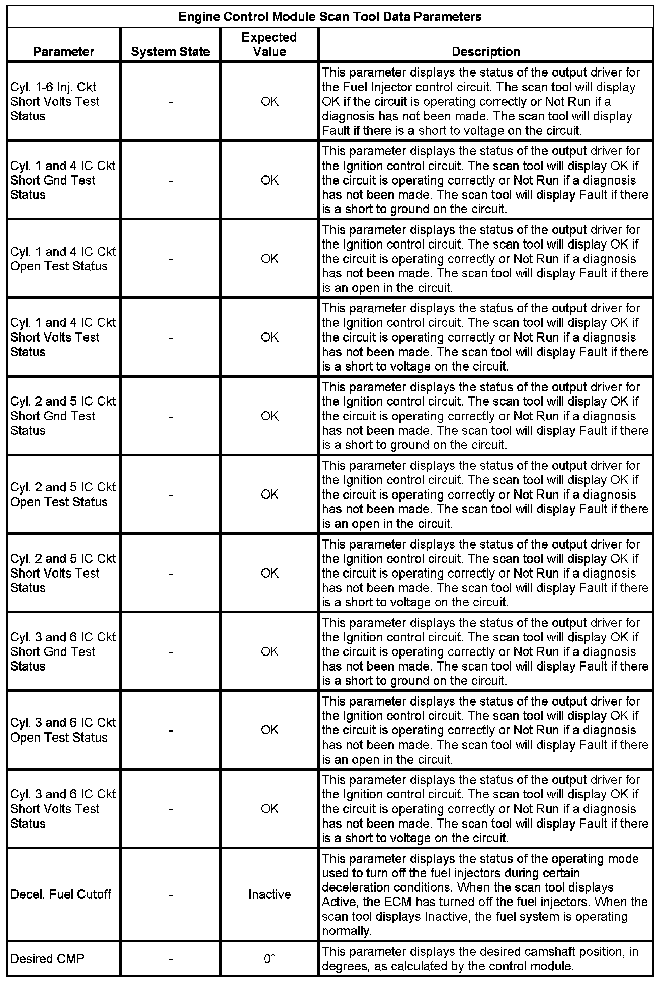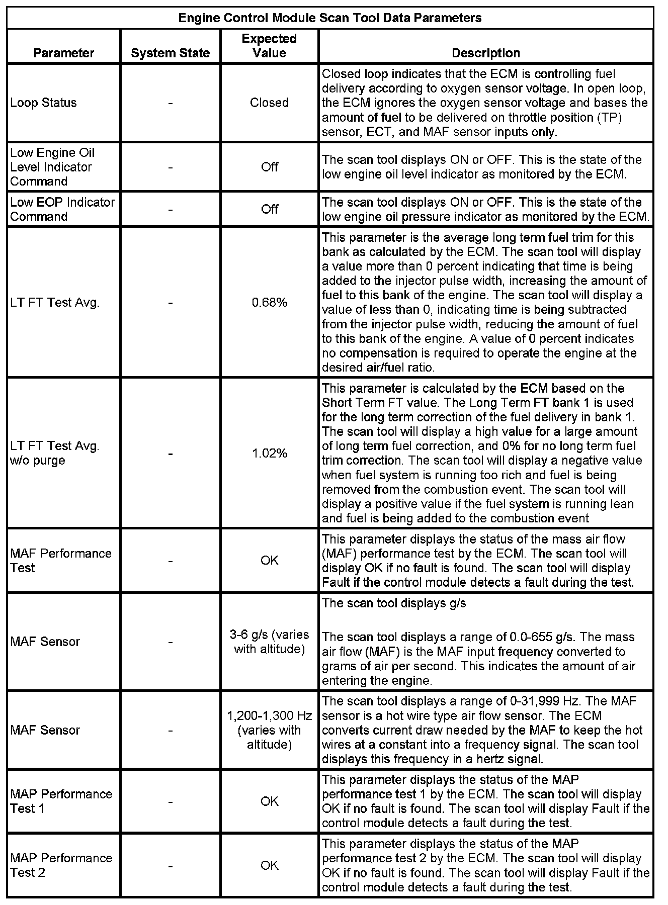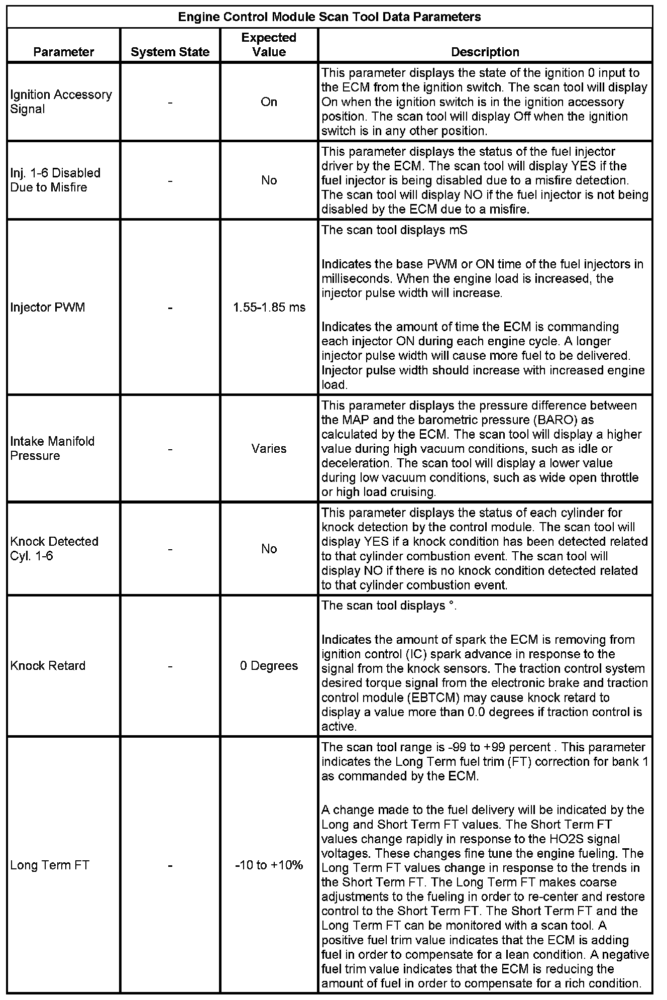 The Engine Control Module Scan Tool Data List contains all engine-related parameters that are available on the scan tool. The list is arranged in alphabetical order. A given parameter may appear in any one of the data lists, and in some cases may appear more than once, or in more than one data list in order to group certain related parameters together.