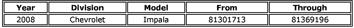 Involved are certain 2008 model year Chevrolet Impala vehicles equipped with dual zone manual climate control (RPO CJ3) and built within the VIN breakpoints shown above.